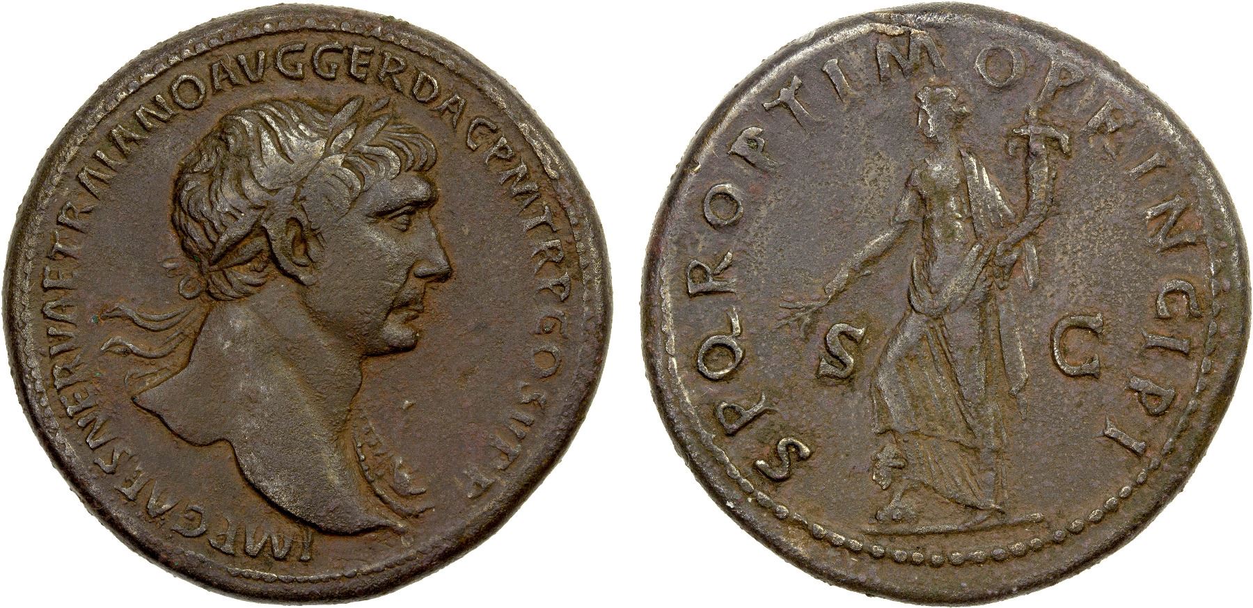ROMAN EMPIRE: Trajan, 98-117 AD, AE sestertius (27.09g), Rome, struck 103-111 AD, Choice VF