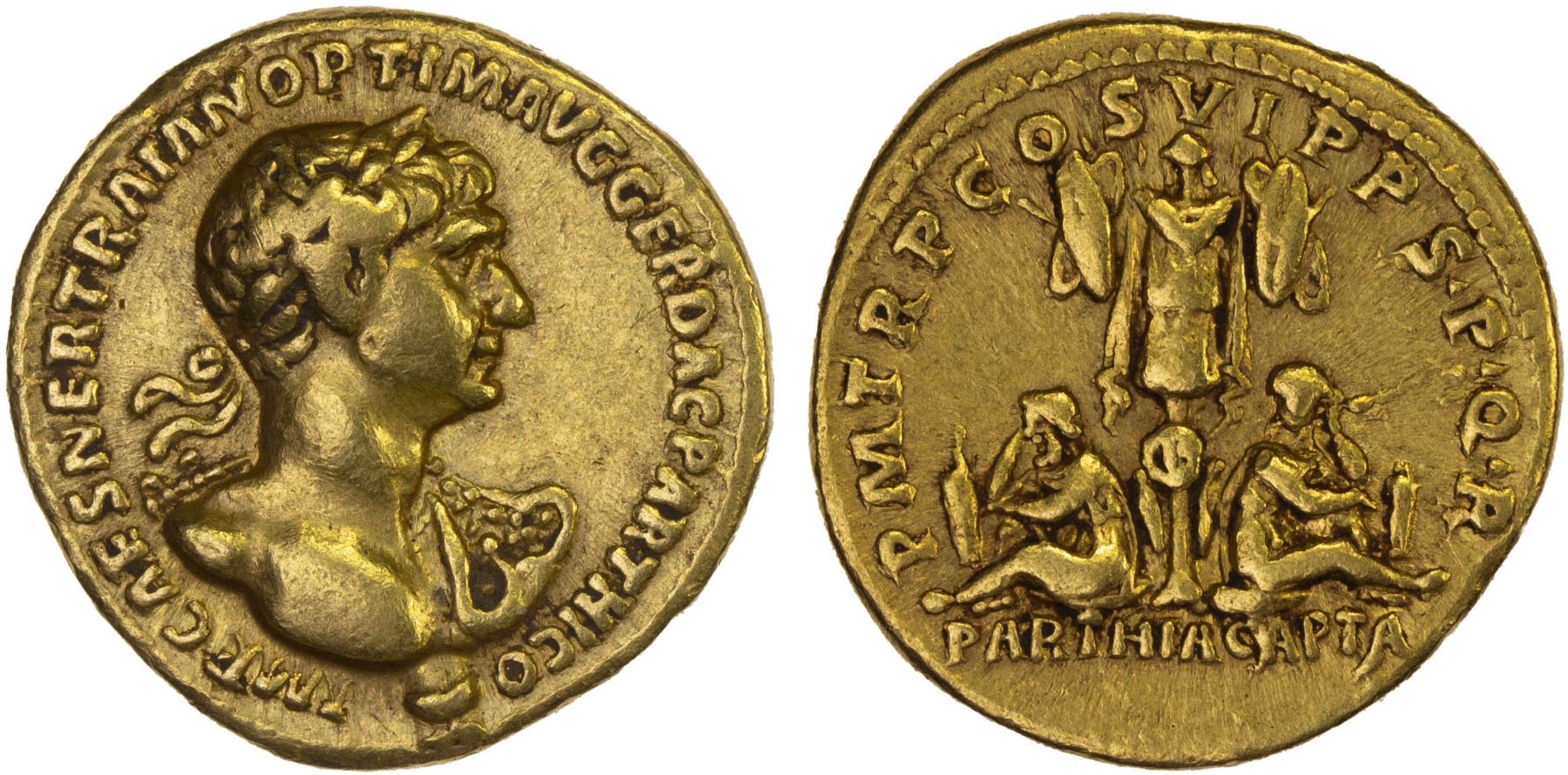 ROMAN EMPIRE: Trajan, 98-117 AD, AV aureus (7.15g), Rome, 116, RIC-325, Biaggi-497 (same dies), laureate bust right, wearing aegis over left shoulder, globe below bust, IMP CAES NER TRAIAN OPTIM AVG GER DAC PARTHICO // trophy between two Parthians in mourning pose seated below, P M TR P COS VI P P S P Q R, PARTHIA CAPTA in exergue, VF.