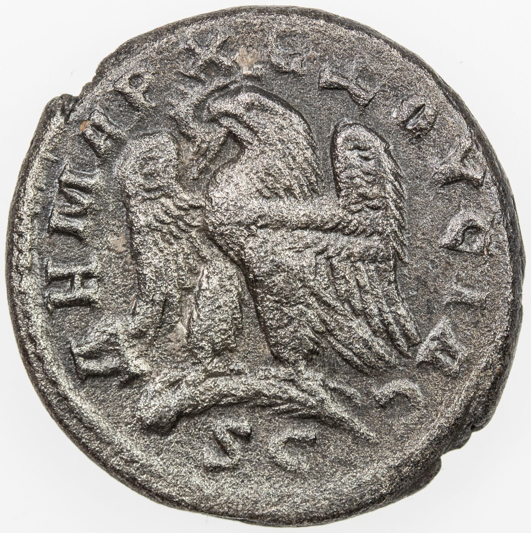 ROMAN EMPIRE: Trajan Decius, 249-251 AD, BI tetradrachm (10.49g), Antioch, Syria, Prieur-526 var, laureate, draped and cuirassed bust right. seen from the back, two dots beneath the bust for Officina 2 // eagle standing left on palm branch, head left, tail right, wings spread, holding wreath in beak, SC in exergue, F-VF.