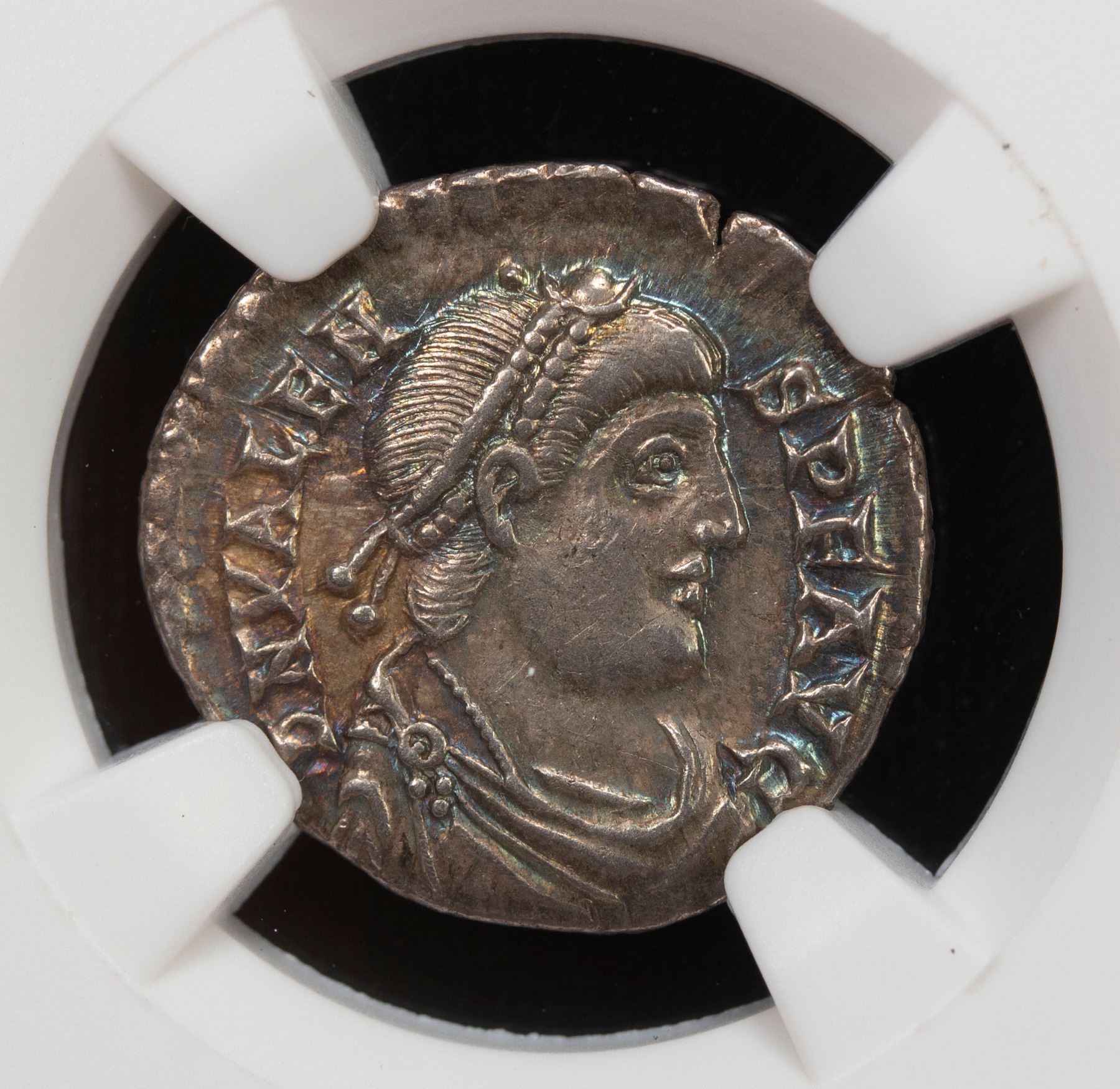 ROMAN EMPIRE: Valens, 364-378 AD, AR siliqua (1.92g), ND (368-75 AD), S-19675, Trier Mint issue, diademed and draped bust right // Roma holding Victory with VRBS ROMA around and TR PS in exergue, toned, excellent strike, NGC graded Choice EF Strike:5/5, Surface: 4/5.
