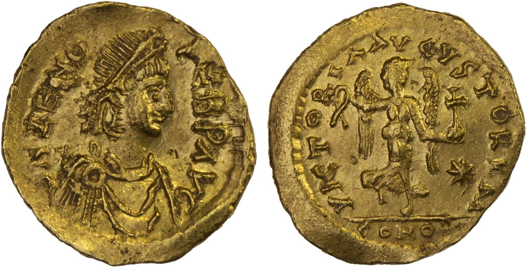 ROMAN EMPIRE: Zeno, second reign, 476-491 AD, AV tremissis (1.49g), Constantinople, RIC-914, diademed, draped, and cuirassed bust right, D N ZENO PERP AVG // Victory advancing right with head left, holding wreath and globus cruciger, star to right, VICTORIA AVGVSTORVM, bold strike and without any weakness, a few faint scratches, choice XF.