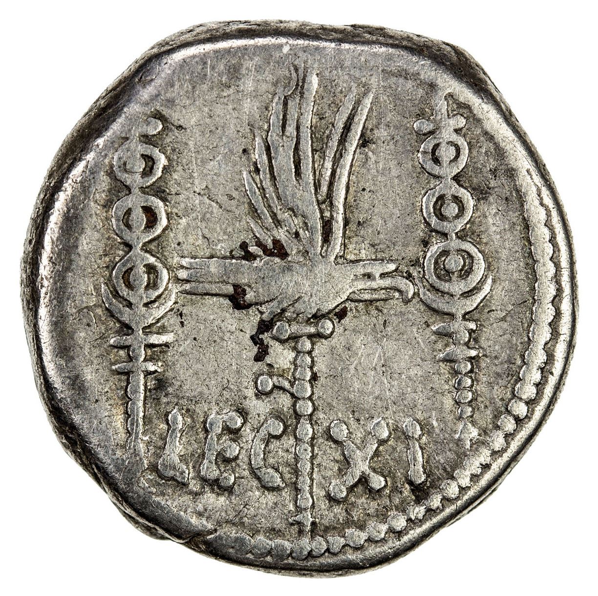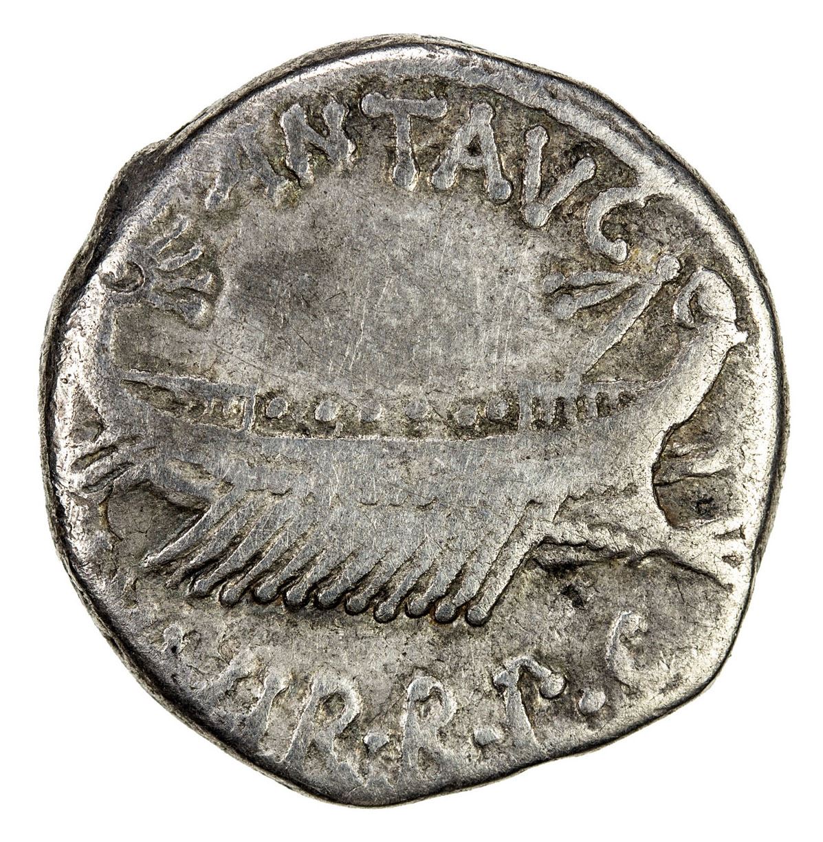ROMAN IMPERATORIAL PERIOD: Mark Anthony, AR denarius (3.51g), legionary issue, 32-31 BC, Crawford-544/25, Sydenham-1229, galley right, ANT AVG III VIR R P C // LEG XI, legionary aquila right between two standards, Fine.