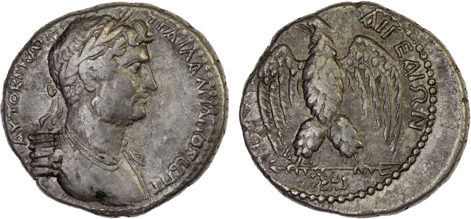 ROMAN PROVINCIAL, CILICIA: Aegeae, Hadrian, 117-138 AD, AR tetradrachm (13.27g), DM, cf. Prieur-721 (reverse design), laureate, draped, and cuirassed bust right // eagle standing facing on arrow with head left, goat kneeling left in exergue, rare type and even rarer variety with eagle's head left, faint graffiti on obverse, VF, ex Dr. Vincent John Adams Flynn Collection (Noble Numismatics Sale 110, Lot 2703), ex Freeman & Sear.