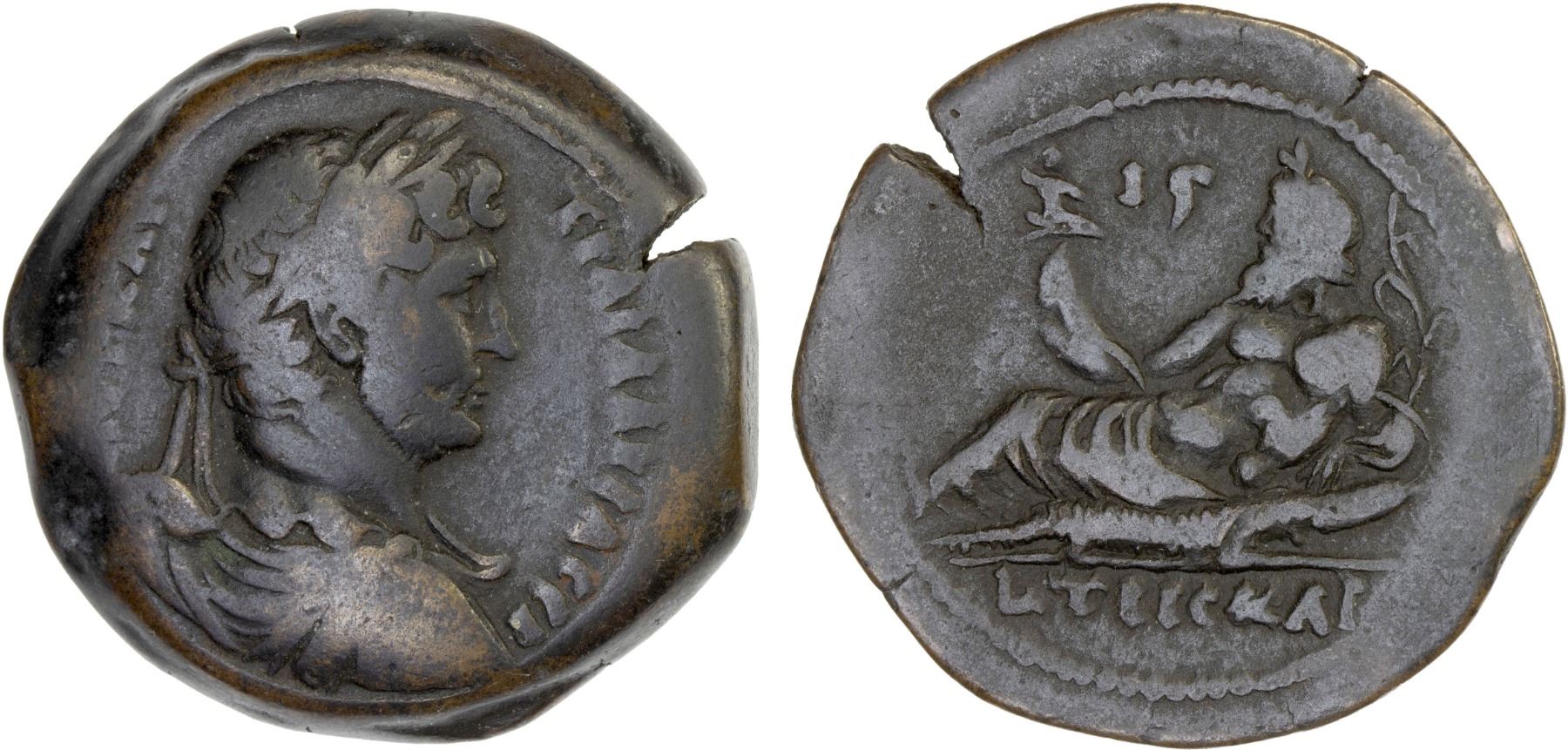 ROMAN PROVINCIAL, EGYPT: Hadrian, 117-138, AE drachm (29.37g), Alexandria, year 13, Fine