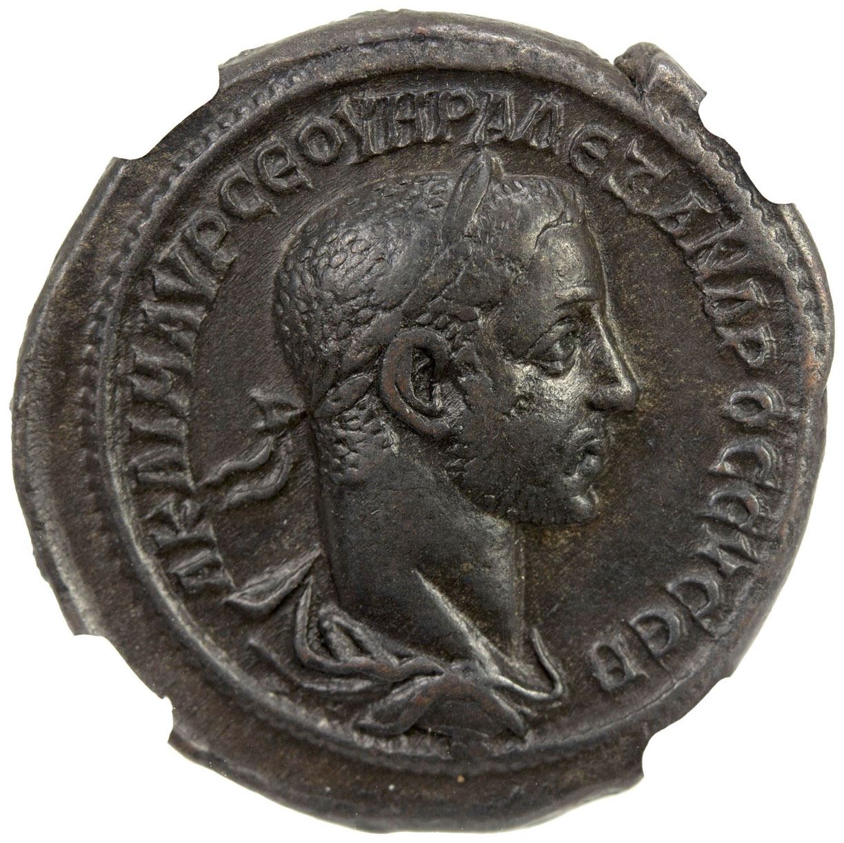 ROMAN PROVINCIAL: EGYPT: Severus Alexander, 222-235 AD, potin tetradrachm (13.37g), Alexandria, year 5 (221/2 AD), Köln-2434, Dattari-4357, K&G-62.70, Emmett-3134.5, struck in Rome, laureate, draped, and cuirassed bust right, A KAI M AYP CEOYHP AΛEΞANΔPOC EYCEB // Serapis standing facing, head left, holding transverse scepter, extending his right hand in salute, L ΠEMΠTOY (date), luscious dark brown surface, gorgeous example with exceptional eye appeal, NGC graded Choice VF (Star) Fine Style, ex Hermanubis Collection, ex CNG 106 Lot 628.