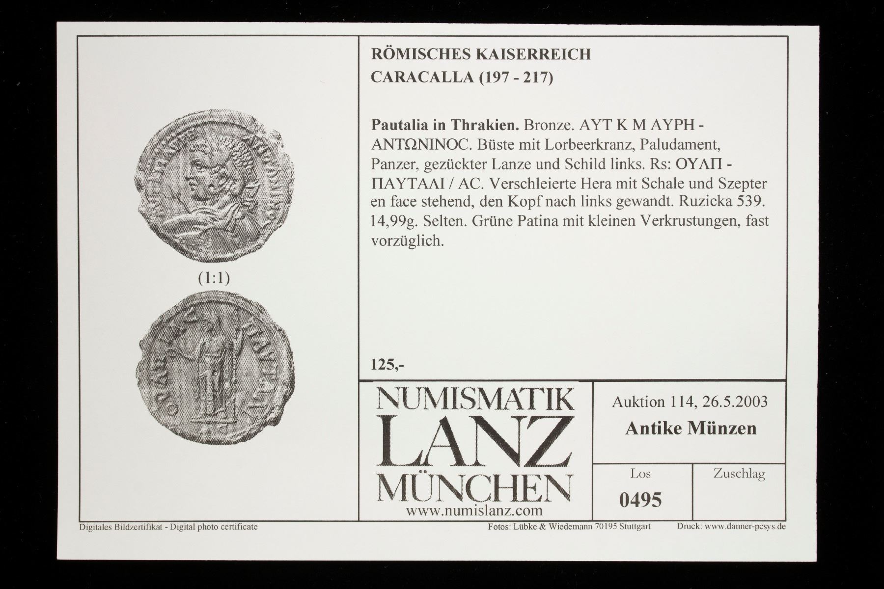 ROMAN PROVINCIAL, THRACE: Pautalia, Caracalla, 198-217, AE30 (14.99g), Tachev-187, Varbanov-5089var, laureate, draped, and cuirassed bust right, holding spear and shield with gorgoneion // Hera standing facing with head left, holding patera and scepter, faint smoothing, dark green patina, accompanied by collector's envelope and display card, Choice VF, ex Thomas R. Miller Collection, ex Numismatik Lanz Auction 114 (2003), Lot 495.