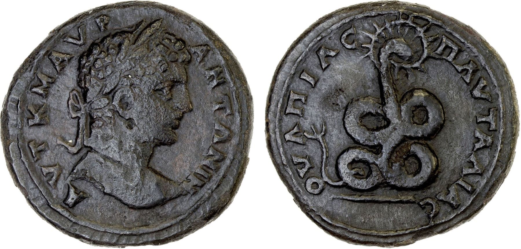 ROMAN PROVINCIAL, THRACE: Pautalia, Caracalla, 198-217, AE30 (15.52g), Tachev-255var, Varbanov-5215var, laureate head right // fourfold coiled serpent (Glycon?) right with radiate-nimbate head and forked tail, faint porosity and smoothing, accompanied by collector's envelope, Choice VF, ex Thomas R. Miller Collection.