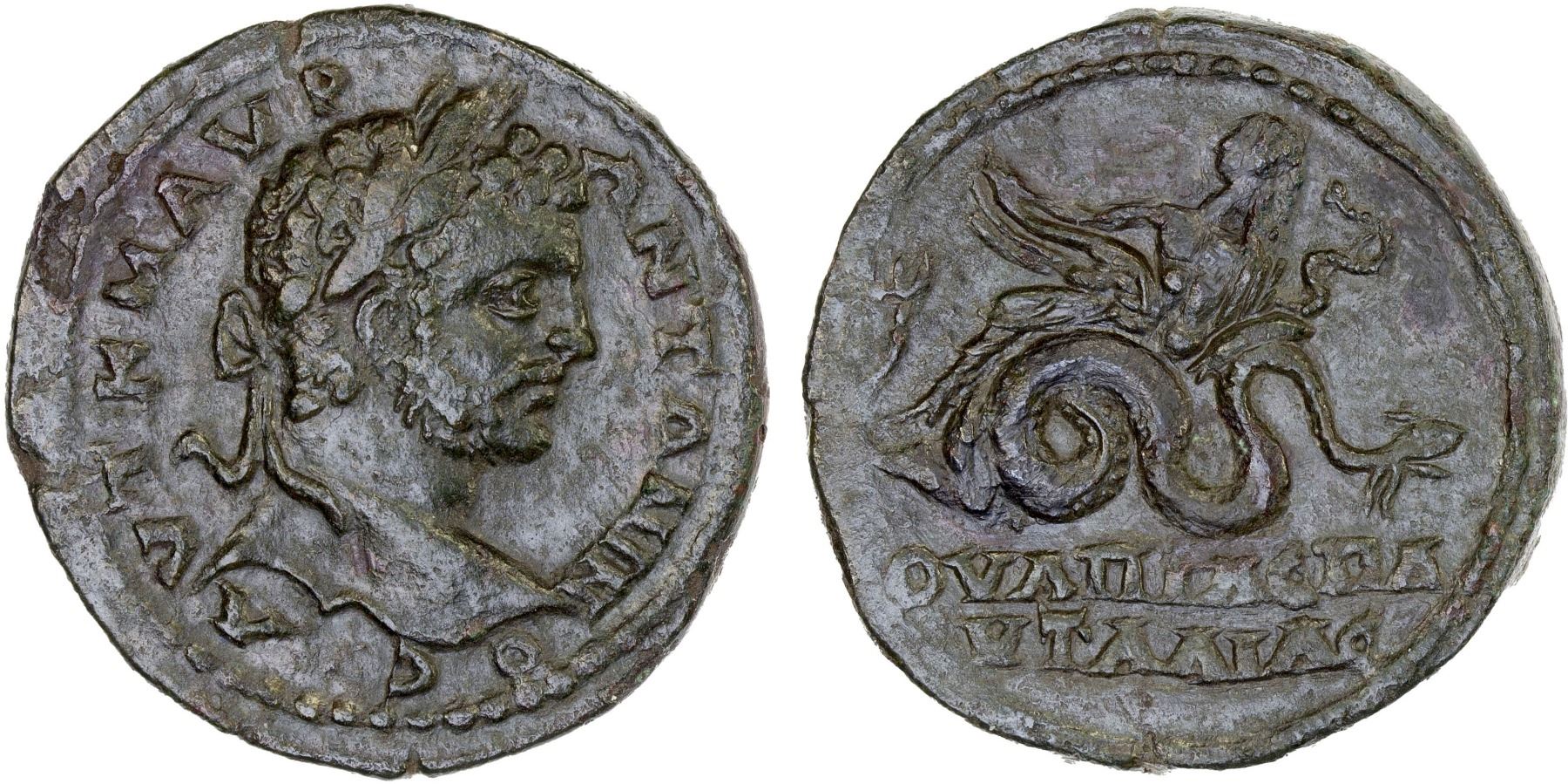 ROMAN PROVINCIAL, THRACE: Pautalia, Caracalla, 198-217, AE30 (17.34g), cf. Tachev-215, cf. Varbanov-5007, laureate head right // Asklepios reclining left with head right on bearded serpent (Glycon?) right, holding staff with coiled serpent, some smoothing, accompanied by collector's envelope, Choice VF, ex Thomas R. Miller Collection, ex CNG e-Auction 182 (2008), Lot 129.