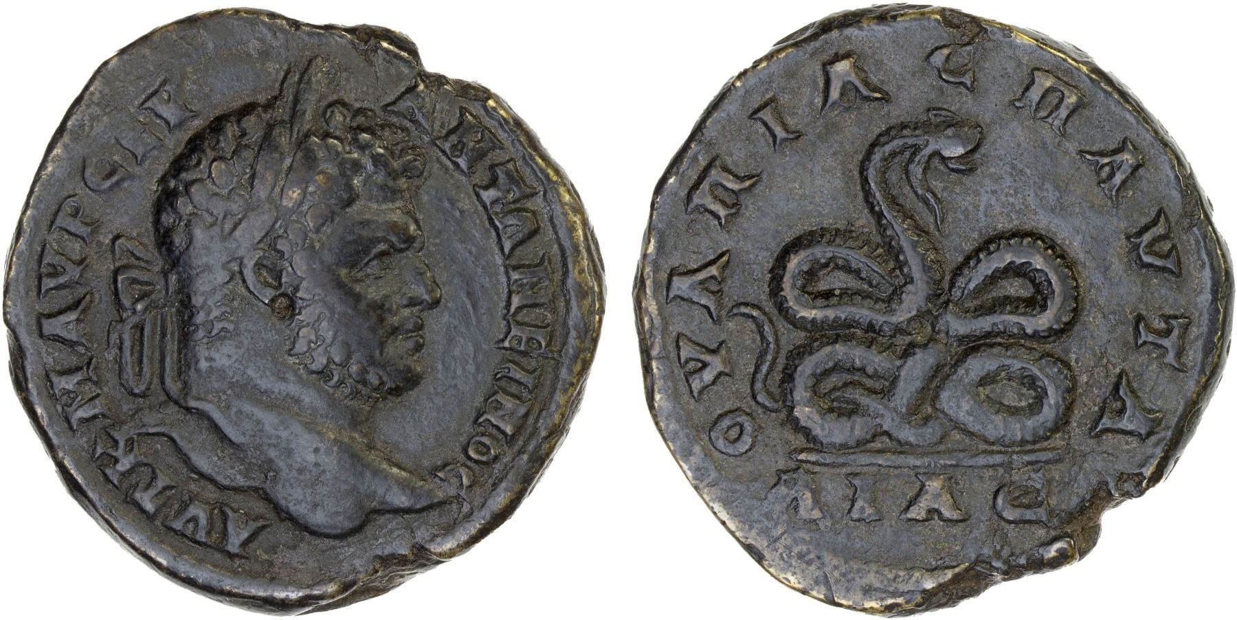 ROMAN PROVINCIAL, THRACE: Pautalia, Caracalla, 198-217, AE32 (17.95g), Tachev-437 (plate example), Varbanov-5202, laureate head right // fourfold coiled serpent (Glycon?) right with bearded head, attractive dark patina, accompanied by collector's envelope, Choice VF, ex Thomas R. Miller Collection, ex CNG e-Auction 24 (2001), Lot 61877.
