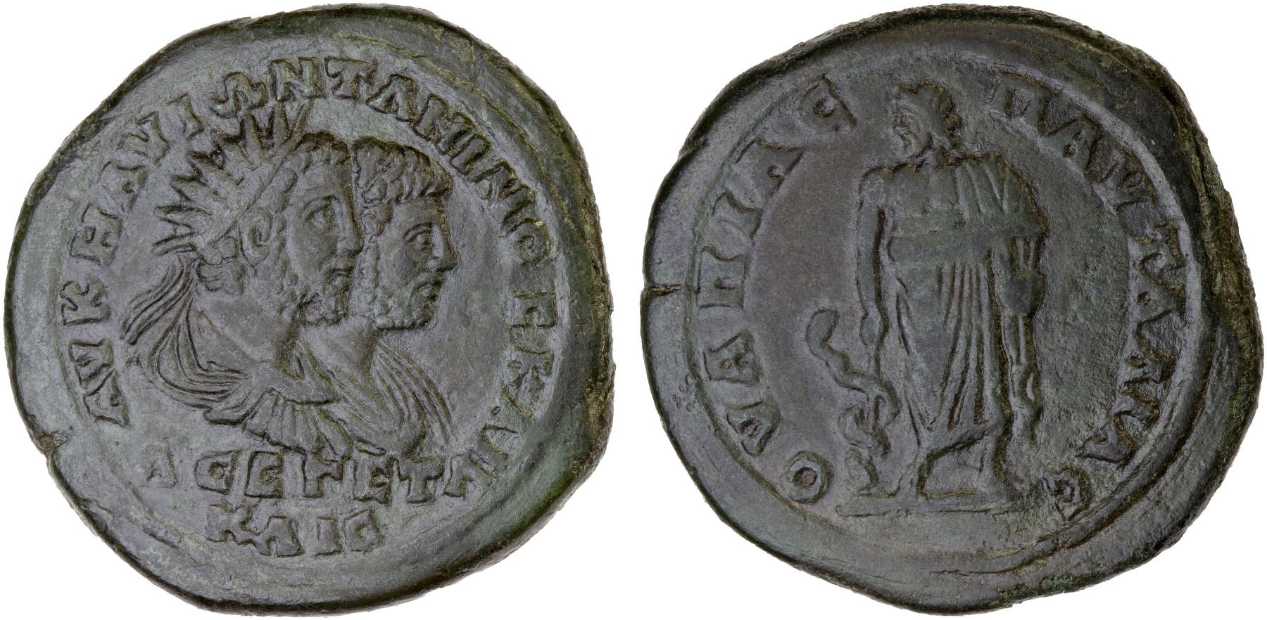 ROMAN PROVINCIAL, THRACE: Pautalia, Caracalla & Geta, 209-211, AE31 (15.30g), Tachev-44, Varbanov-5289, Moushmov-4310, joint issue, conjoined draped busts of Caracalla, radiate, and Geta right, AV K M AVP ANTONINOC KAI / Λ CE ΓETAC / KAIC // Asklepios standing facing with head left, holding staff with coiled serpent, OVΛΠIAC ΠAVTAΛIAC, some smoothing, extremely rare, accompanied by collector's envelope, Choice VF, ex Thomas R. Miller Collection, ex TimeLine Auctions May 2015, Lot 2182.