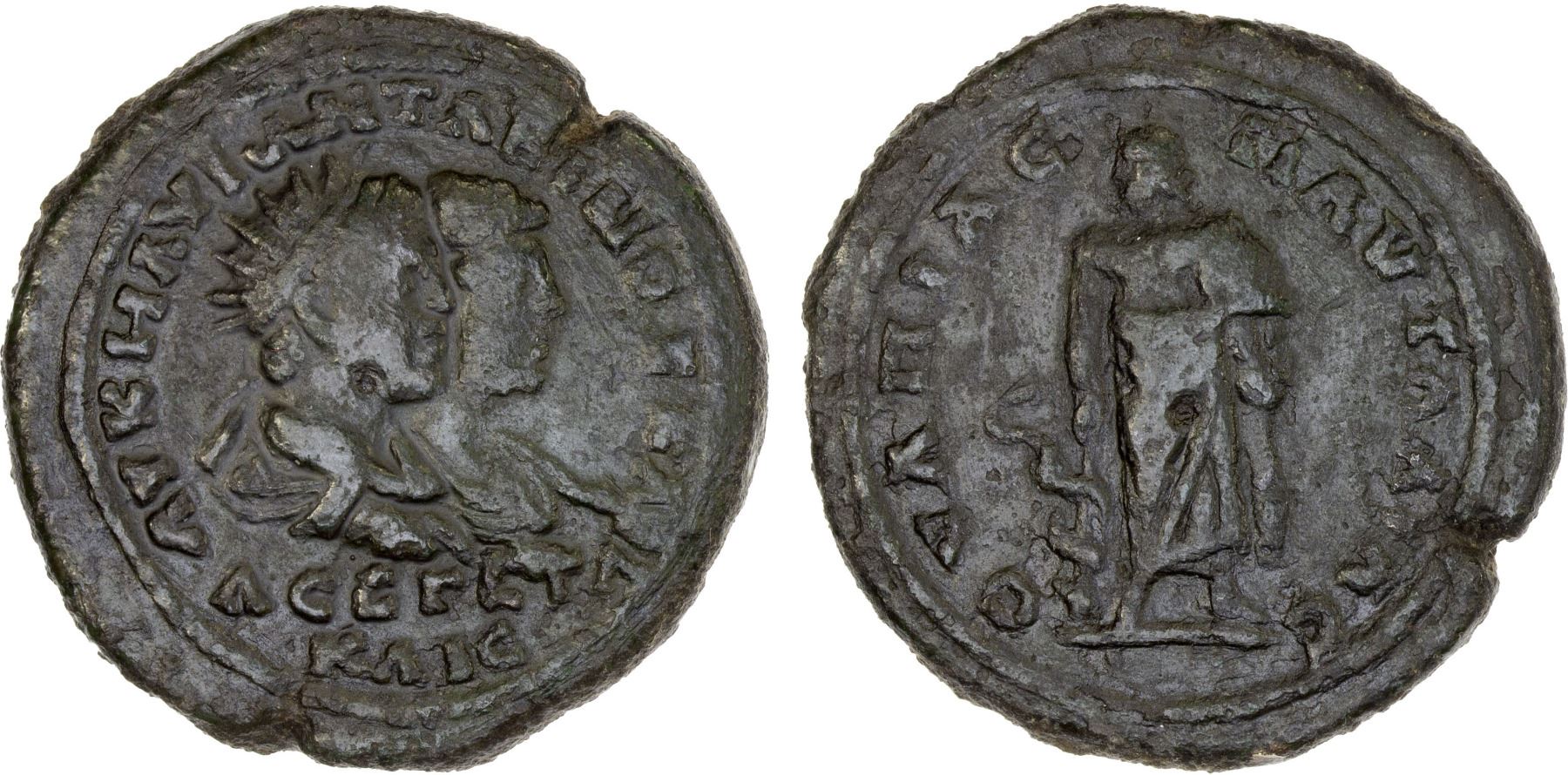 ROMAN PROVINCIAL, THRACE: Pautalia, Caracalla & Geta, 209-211, AE32 (18.64g), Tachev-44, Varbanov-5289, joint issue, conjoined draped busts of Caracalla, radiate, and Geta right // Asklepios standing facing with head left, holding staff with coiled serpent, some smoothing, extremely rare, accompanied by collector's envelope and display card, Choice VF, ex Thomas R. Miller Collection, ex Numismatik Lanz Auction 114 (2003), Lot 511.