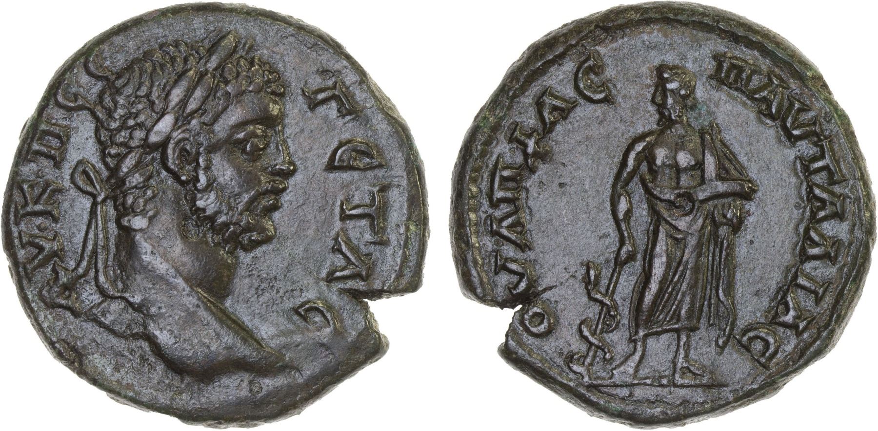 ROMAN PROVINCIAL, THRACE: Pautalia, Geta, 209-211 AD, AE29 (16.78g), Varbanov-5332, laureate head right // Asklepios standing facing with head left, holding staff with coiled serpent, light smoothing in fields, attractive glossy patina, VF-XF, ex Dr. Vincent John Adams Flynn Collection.