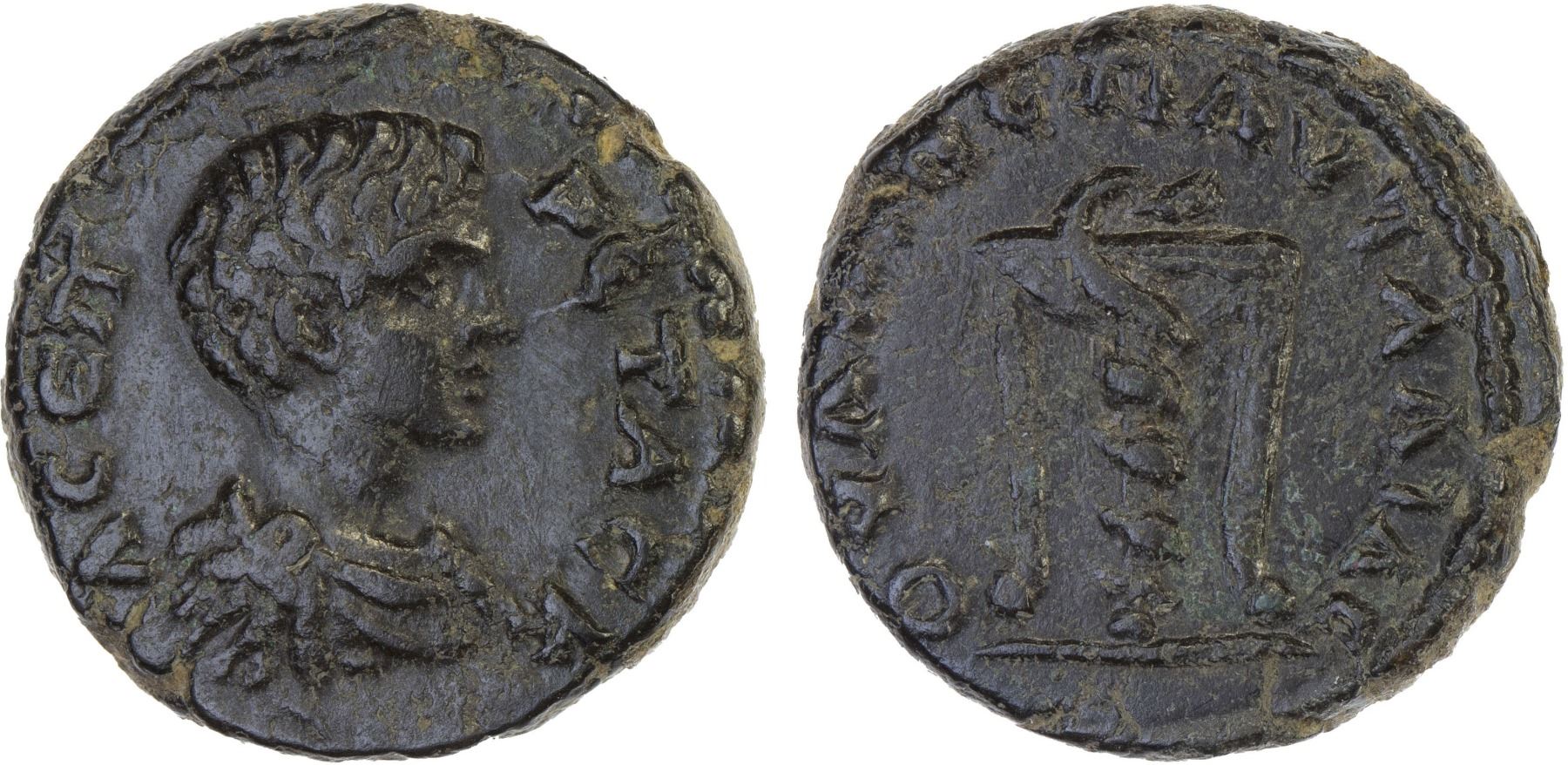 ROMAN PROVINCIAL, THRACE: Pautalia, Geta, as caesar, 198-209, AE17 (4.61g), Tachev-15var, Varbanov-5414var, draped and cuirassed bust right // tripod with serpent coiled around central leg, faint smoothing, glossy patina, accompanied by collector's envelope, Choice VF, ex Thomas R. Miller Collection.