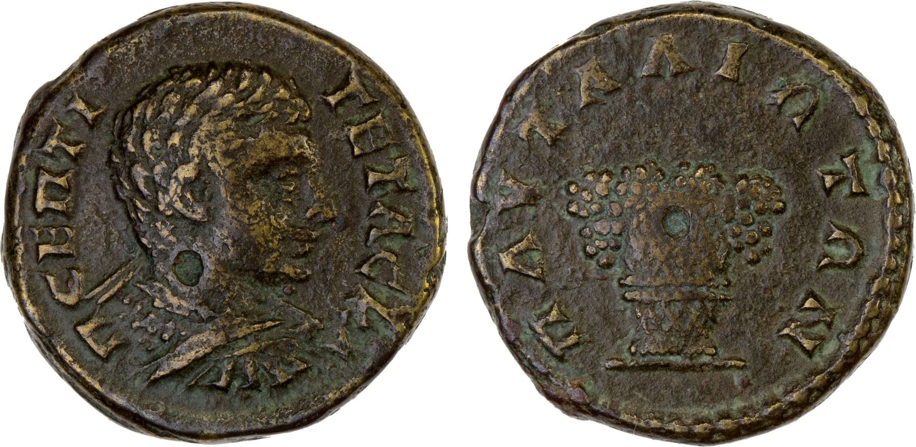 ROMAN PROVINCIAL, THRACE: Pautalia, Geta, as caesar, 198-209, AE18 (4.60g), Tachev-123, Varbanov-5347var, draped and cuirassed bust right // basket containing grapes, accompanied by collector's envelope, VF, ex Thomas R. Miller Collection.
