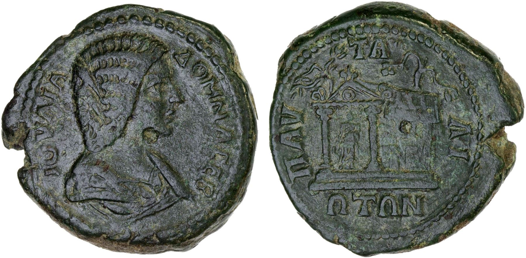 ROMAN PROVINCIAL, THRACE: Pautalia, Julia Domna, augusta, 193-211, AE24 (8.82g), Tachev-83 (plate example), Varbanov-4931, draped bust right // distyle temple seen in perspective, with statue of Asklepios standing inside, two trees behind, attractive green patina, accompanied by collector's envelope, Choice VF, ex Thomas R. Miller Collection, ex Triton VIII (2005), Lot 745.