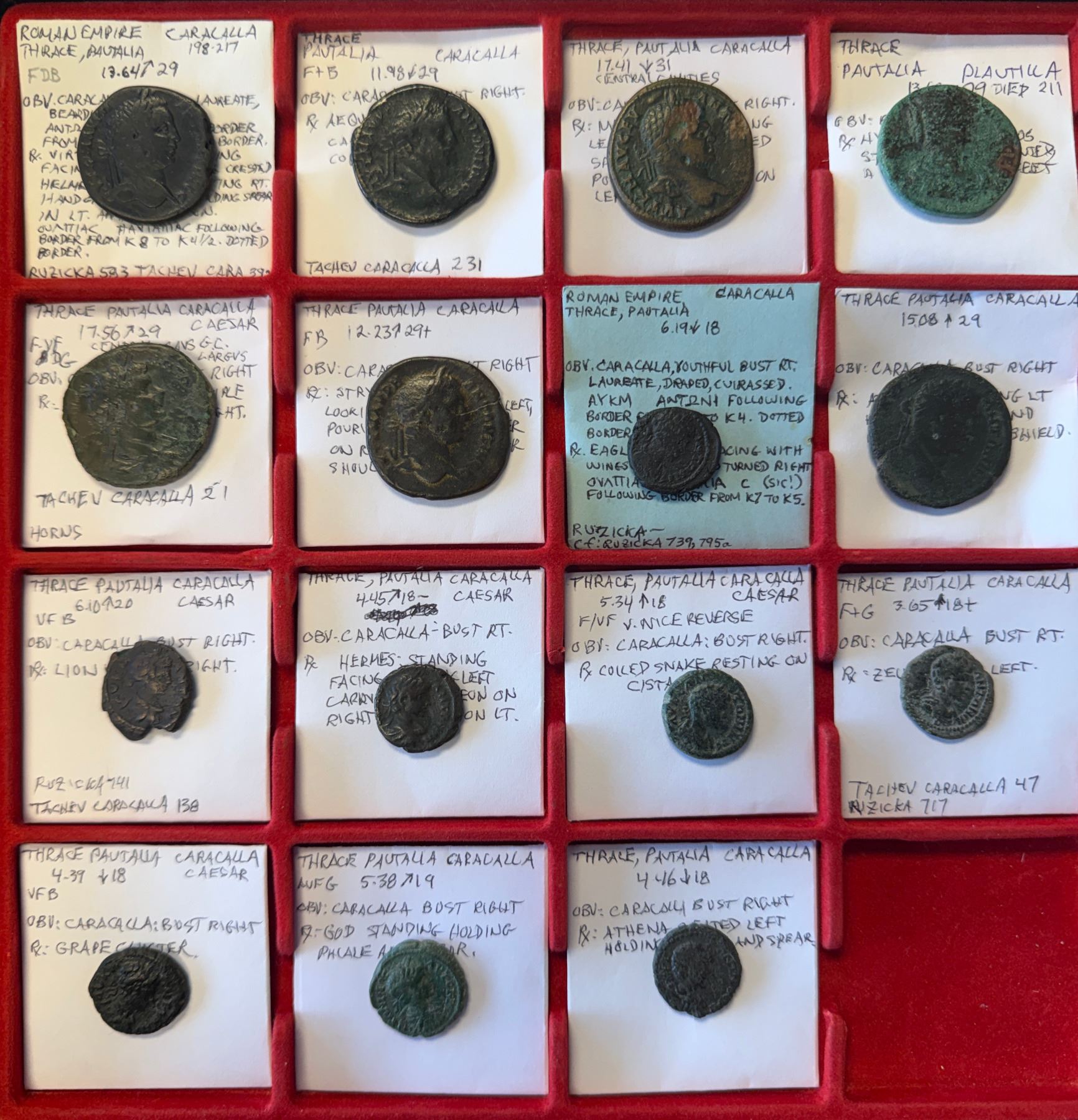 ROMAN PROVINCIAL, THRACE: Pautalia, LOT of 15 bronzes, all Caracalla except one Plautilla, with a variety of interesting reverse types (incl. Asklepios and Hygieia with Telesphoros, Dionysos pouring wine from jug, river god Strymon, four-coiled serpent, etc.); all with basic attribution, some with catalog numbers, several quite rare; most in Fine to VF conditions, the majority with decent patina, a few with light to moderate porosity; retail value $500, lot of 15 pieces, ex Thomas R. Miller Collection.