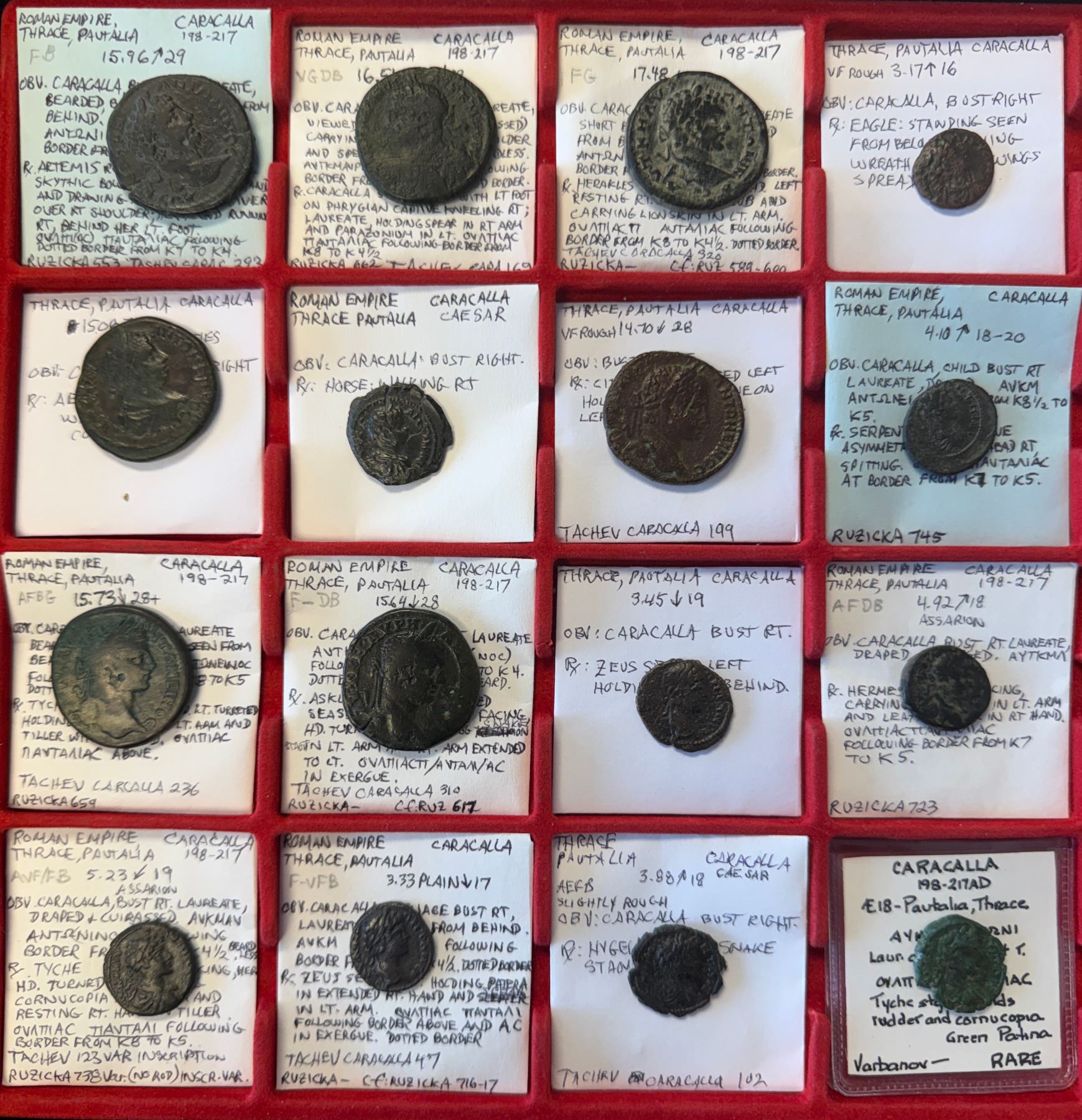 ROMAN PROVINCIAL, THRACE: Pautalia, LOT of 16 bronzes, all from Caracalla, with a variety of interesting reverse types (incl. Asklepios riding flying serpent, Athena feeding serpent coiled around tree, Artemis hunting with hound, emperor spurning bound captive, etc.); all with basic attribution, some with catalog numbers, some quite rare; most in Fine to VF conditions, most with decent patina, a few with scratches or smoothing marks; retail value $500, lot of 16 pieces, ex Thomas R. Miller Collection.
