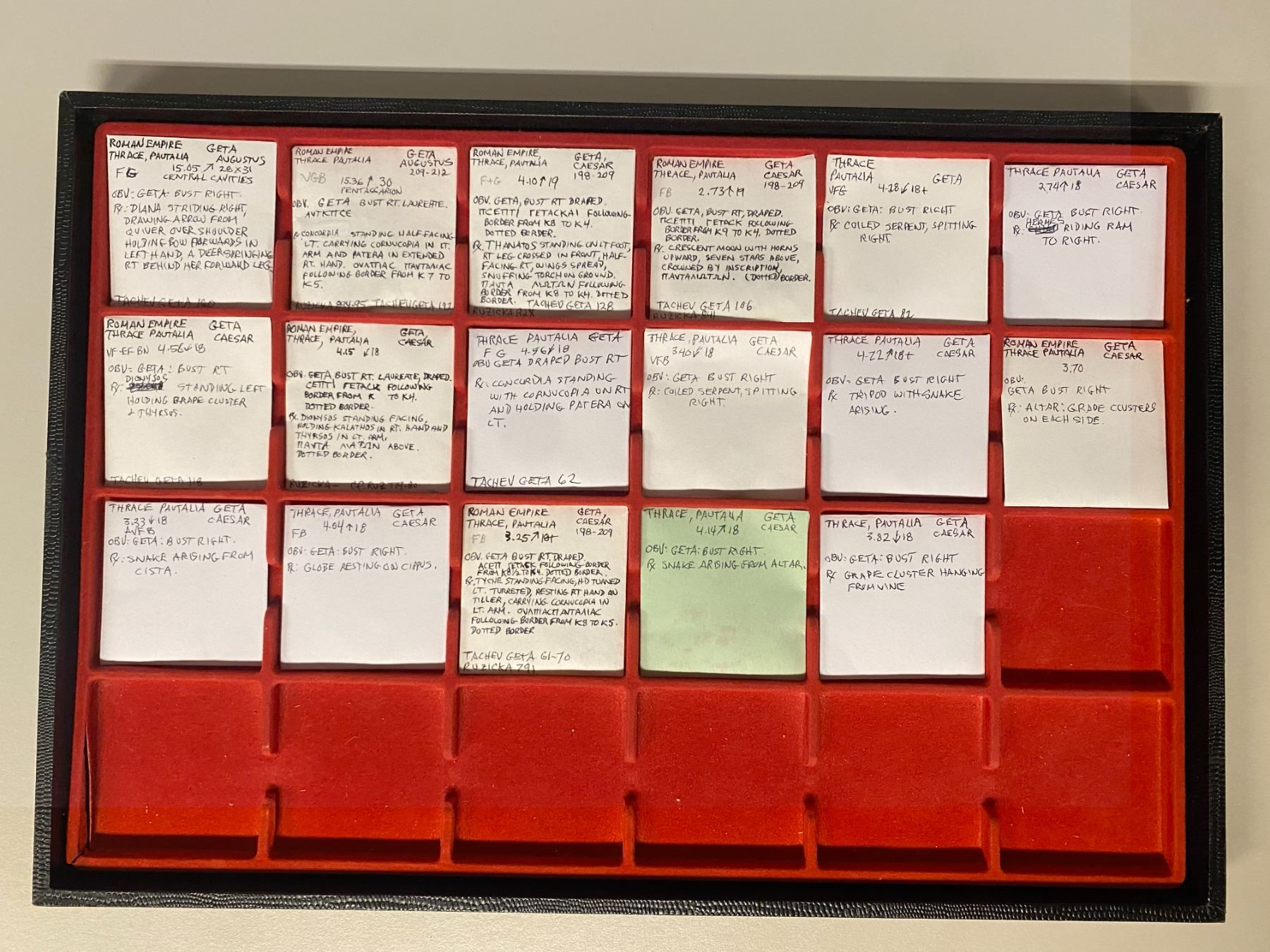 ROMAN PROVINCIAL, THRACE: Pautalia, LOT of 17 bronzes, all Geta, including 2 large coins issued as emperor, with a variety of interesting reverse types (incl. Artemis hunting with hound, winged Eros-Thanatos, Hermes riding on ram, etc.), all with basic attribution, some with catalog numbers, quite a few rare; most in Fine to VF conditions, the majority with decent patina, some with light to moderate smoothing; retail value $450, lot of 17 pieces, ex Thomas R. Miller Collection.