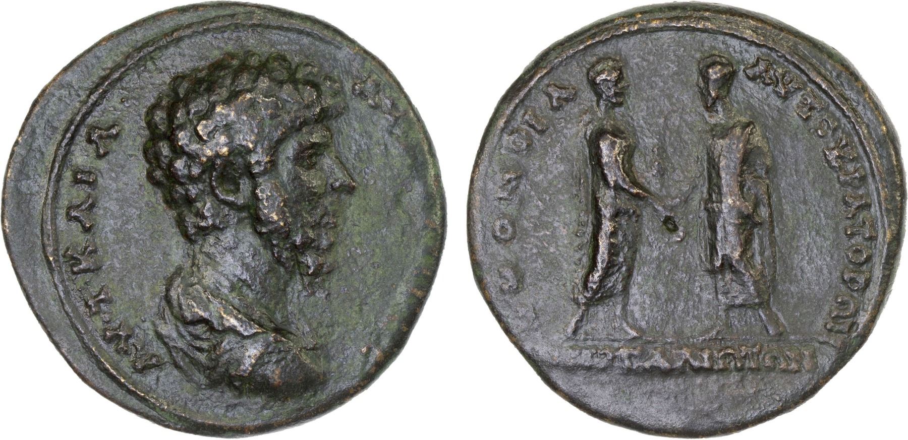 ROMAN PROVINCIAL, THRACE: Pautalia, Lucius Verus, 161-169, AE31 (18.15g), Tachev-2, Varbanov--, RPC-7387, draped and cuirassed bust right // Marcus Aurelius and Lucius Verus, both togate and holding scroll, standing vis-à-vis and clasping hands, some smoothing, glossy dark green patina, accompanied by collector's envelope, VF, ex Thomas R. Miller Collection.