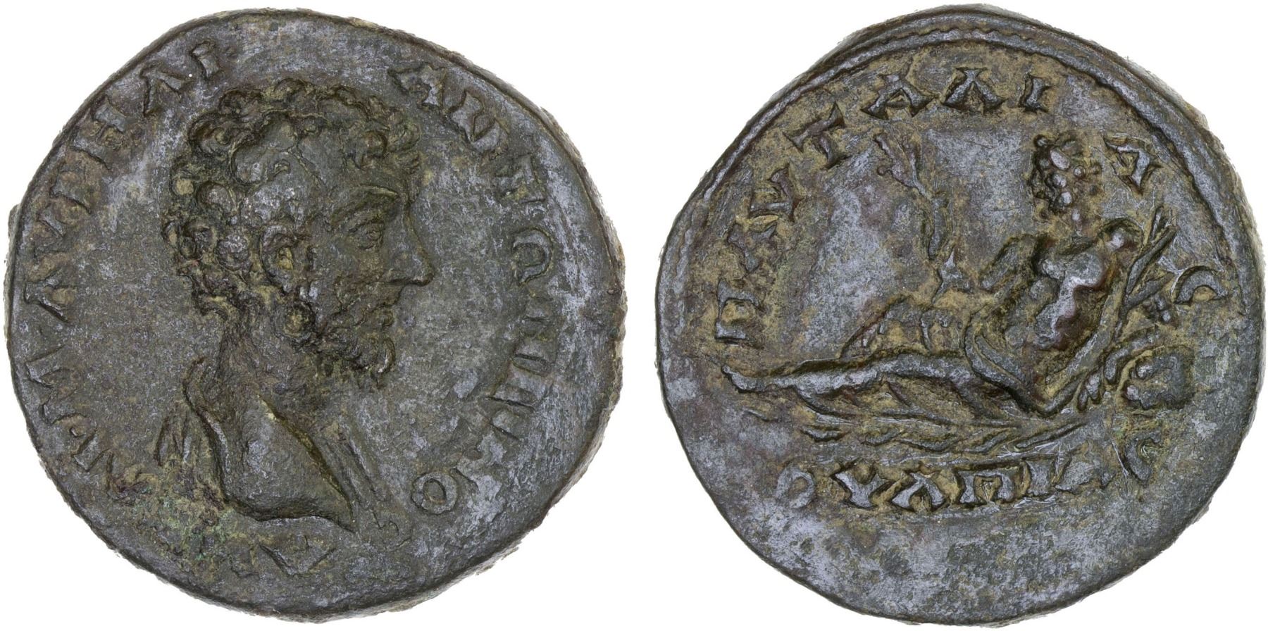 ROMAN PROVINCIAL, THRACE: Pautalia, Marcus Aurelius, 161-180, AE24 (10.07g), Tachev-39 (plate example), Varbanov-4438, Ruzicka-53, draped bust right // river God Strymon reclining left, holding branch in right hand and cradling reeds in left arm, light smoothing marks, accompanied by collector's envelope, Choice VF, ex Thomas R. Miller Collection, ex Gorny & Mosch Auction 122 (2003), Lot 1733.