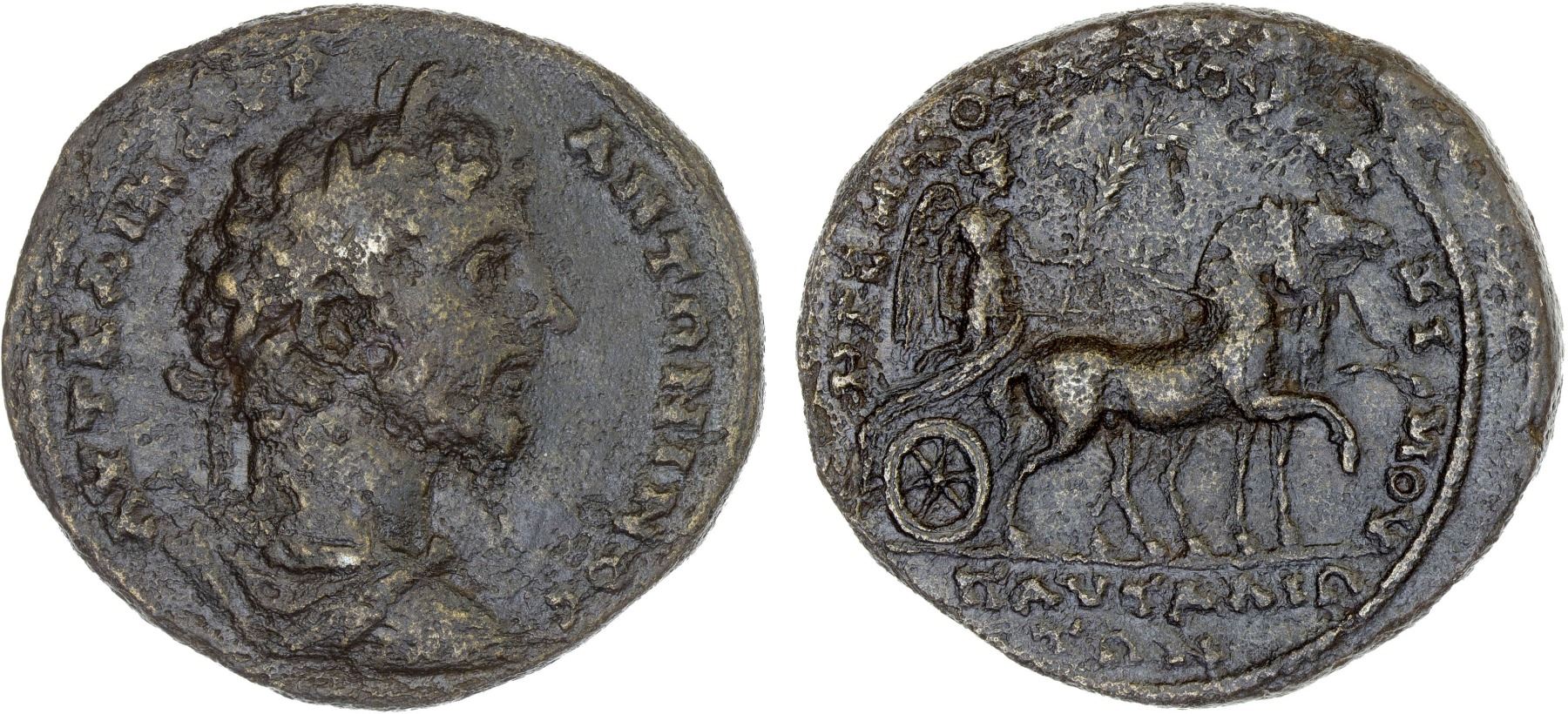 ROMAN PROVINCIAL, THRACE: Pautalia, Marcus Aurelius, 161-180, AE31 (20.36g), Tachev-26, Varbanov--, citing Marcus Quintus Tullius Maximus as legatus Augusti pro praetore Thraciae (161-163), laureate, draped, and cuirassed bust right // Nike driving biga right, holding palm frond and reins, some porosity, accompanied by collector's envelope, VF, ex Thomas R. Miller Collection.