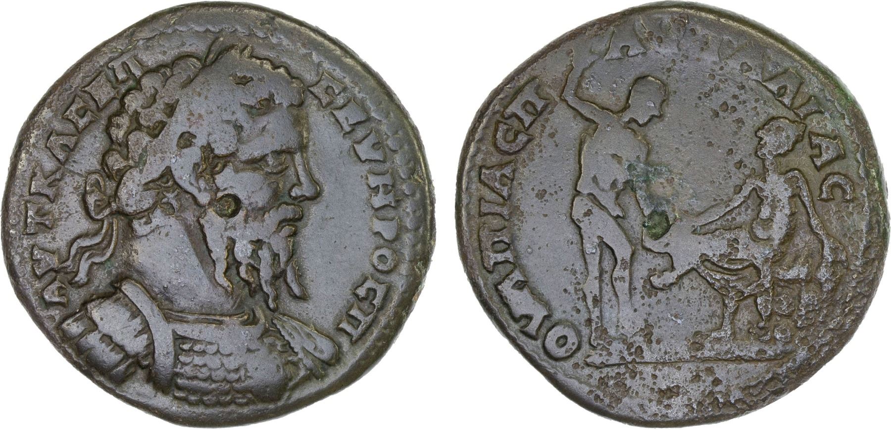 ROMAN PROVINCIAL, THRACE: Pautalia, Septimius Severus, 193-211, AE29 (13.35g), Tachev-238 (plate example), Varbanov-4785, laureate, draped, and cuirassed bust right // satyr dancing right, raising right hand in the air, extending left hand toward nymph seated left and cross-legged on bed, very rare, light porosity and smoothing, accompanied by collector's envelope, F-VF, ex Thomas R. Miller Collection, ex Gorny & Mosch Auction 117 (2002), Lot 370. The reverse is based on a popular contemporary theme known as Invitation to Dance, which features a dancing satyr next to a seated nymph. Several of these sculptures have survived since ancient times and are now on display in various museums.