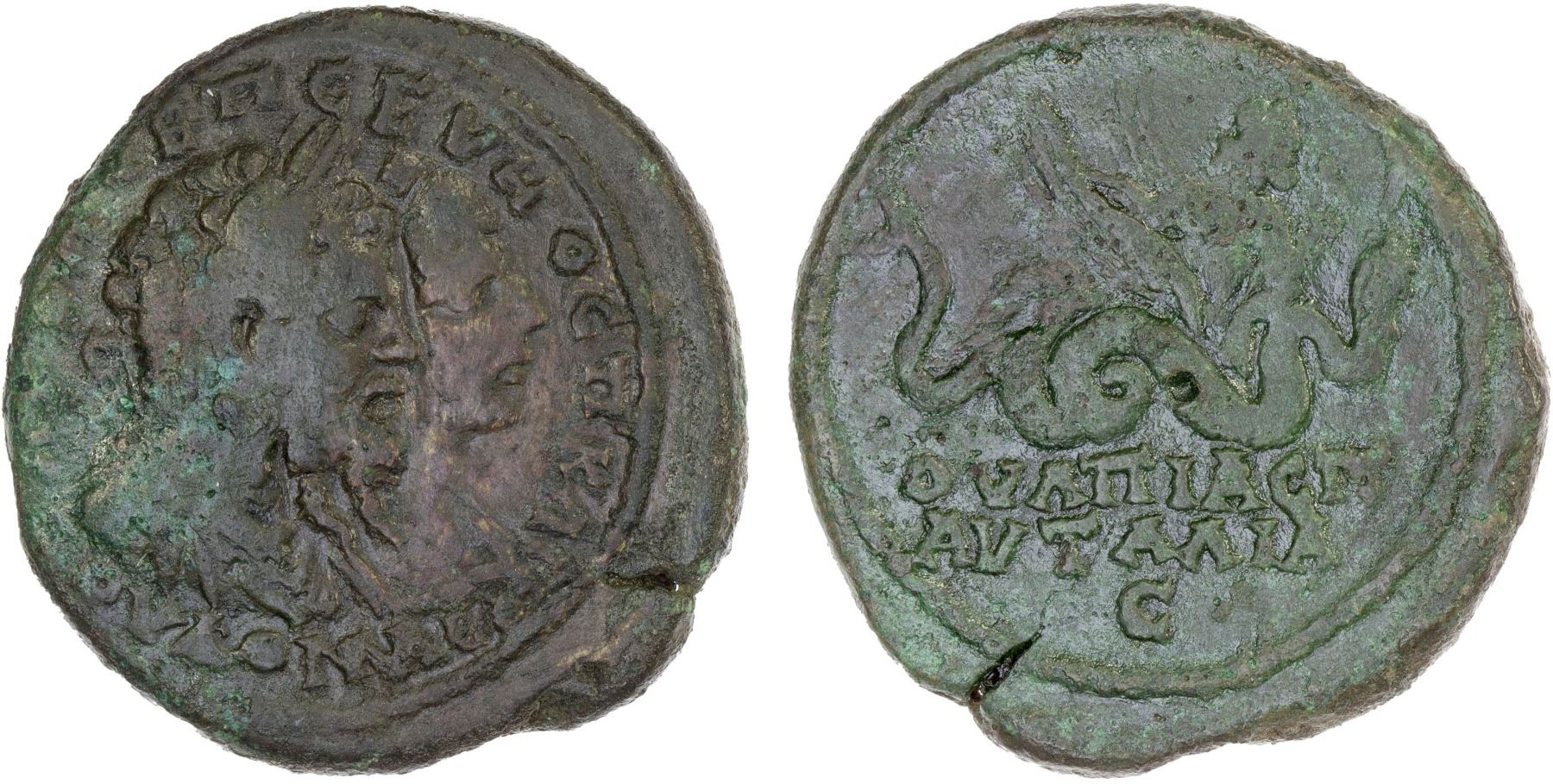 ROMAN PROVINCIAL, THRACE: Pautalia, Septimius Severus, 193-211, AE30 (15.85g), Tachev-157, Varbanov-4856, joint issue, conjoined busts of Septimius Severus (laureate, draped, and cuirassed) and Julia Domna (draped) right // Asklepios reclining left on winged serpent right, light smoothing, accompanied by collector's envelope, F-VF, ex Thomas R. Miller Collection, ex Gorny & Mosch Auction 160 (2007), Lot 1828.