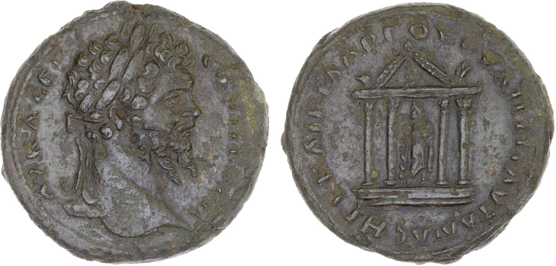 ROMAN PROVINCIAL, THRACE: Pautalia, Septimius Severus, 193-211, AE30 (18.02g), Tachev-68 (plate example), Varbanov-4631, citing Gaius Caecina Largus as legatus Augusti pro praetore Thraciae (198-201), laureate head right, AV K Λ CEΠ CEYHPOC Π // tetrastyle temple with statue of Asklepios standing right and his head left, holding serpent staff, HΓE KAIKI ΛAPΓOV OVΛΠI ΠAYTAΛIAC, gorgeous engraving, attractive patina despite faint porosity, accompanied by collector's envelope and display card, XF, ex Thomas R. Miller Collection, ex Numismatik Lanz Auction 117 (2003), Lot 863.