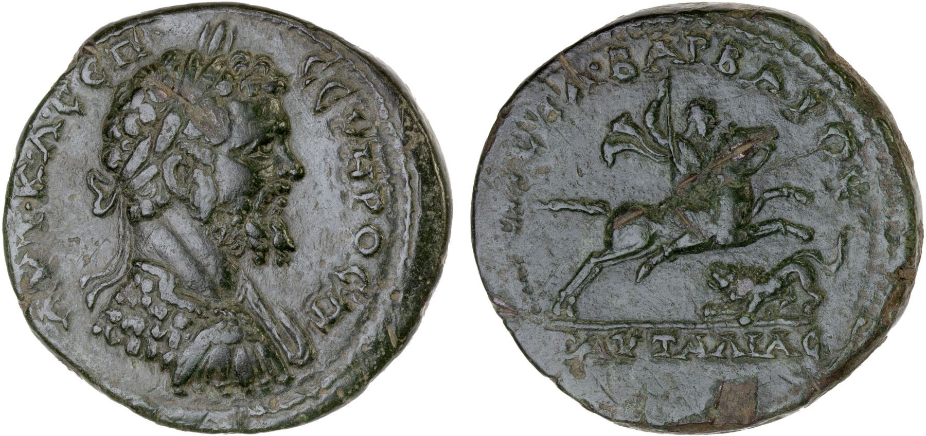 ROMAN PROVINCIAL, THRACE: Pautalia, Septimius Severus, 193-211, AE31 (17.99g), Tachev-26, Varbanov-4660, Ruzicka-265, citing Titus Statilius Barbatus as legatus Augusti pro praetore Thraciae (195-198), laureate, draped, and cuirassed bust right, AVT KA CEΠ CEVHPOC Π // emperor on galloping horse right, raising spear to lion crouching left below, [HΓ]EM CTA BAPBAPOV / ΠAVTAΛIAC, a couple scrapes on reverse, green patina, accompanied by collector's envelope and display card, Choice VF, ex Thomas R. Miller Collection, ex Numismatik Lanz Auction 114 (2003), Lot 468.