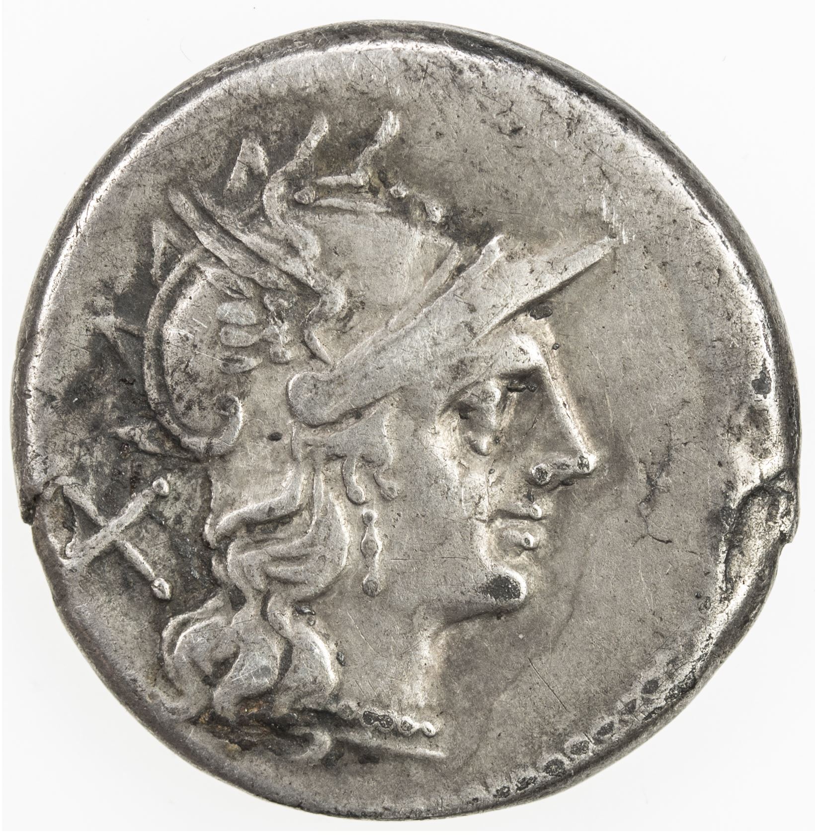 ROMAN REPUBLIC: Anonymous, AR denarius (3.65g), Rome, Crawford-140/1; Sydenham-339, struck 189-180 BC, helmeted head of Roma right, X (mark of value) behind // Luna driving biga right, ROMA, faint scratches, possible fourree, Fine to VF.
