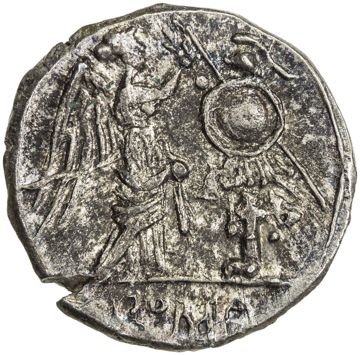 ROMAN REPUBLIC: Anonymous, before 211 BC, AR victoriatus (3.39g), Rome, S-49, Crawford 53/1, laureate head of Jupiter right // Victory standing right, crowning war trophy, bold strike, iridescent toning, choice EF.