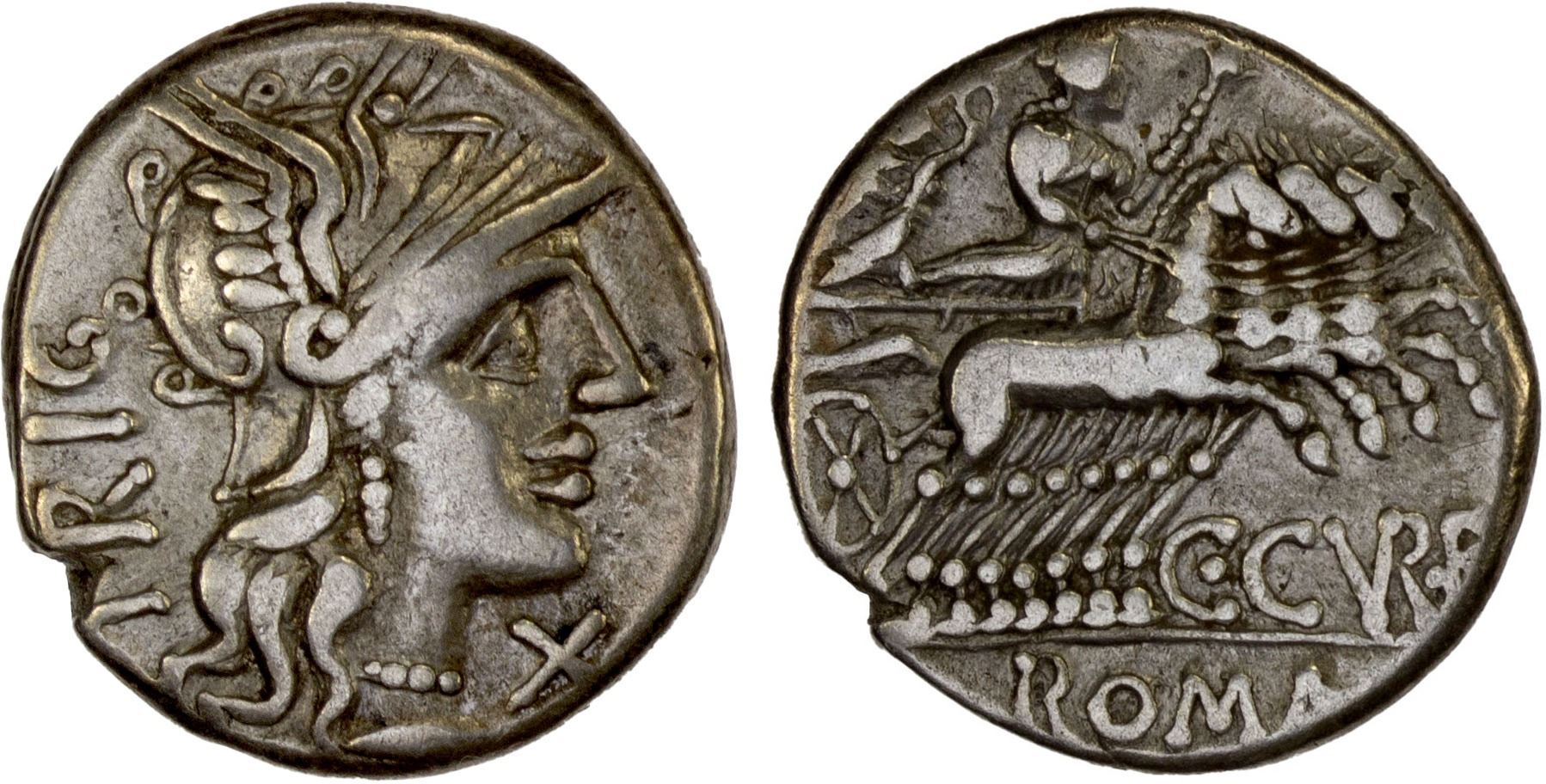 ROMAN REPUBLIC: C. Curiatius, AR denarius (3.91g), Rome, 135 BC, Crawford-240/1a, helmeted head of Roma right, X (mark of value) below chin, TRIG behind // Juno holding scepter and driving quadriga right, being crowned by Victory behind, C CVR F to lower right, ROMA in exergue, F-VF.
