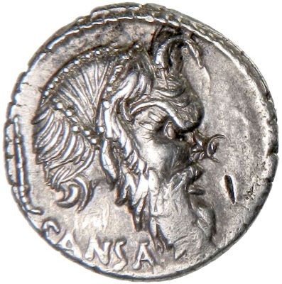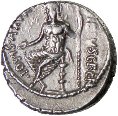 ROMAN REPUBLIC: C. Vibius, 48 BC, AR denarius (3.92g), S-420, mask of Pan, PANSA below / Jupiter Anxurus seated, holding patera & scepter, bold VF.