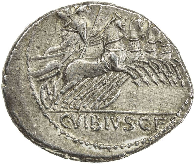 ROMAN REPUBLIC: C. Vibius C.f. Pansa, 90 BC, AR denarius (4.01g), Rome, Crawford-342/5, laureate head of Apollo right; PANSA downwards to left, E below chin // Minerva, holding [trophy] in right hand and reins and spear in left hand, driving galloping quadriga right; C VIBIVS C F in exergue, oblong planchet, EF to About Unc.