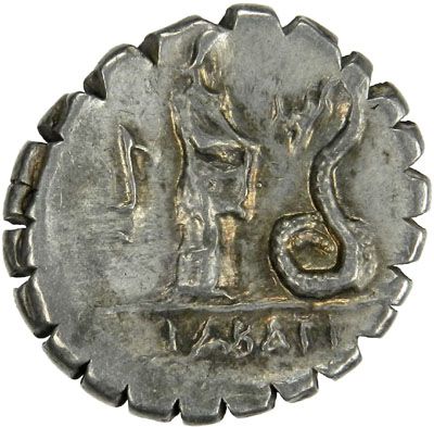 ROMAN REPUBLIC: L. Roscius Fabatus, 64 BC, AR Denarius (3.94g), Rome mint, Crawford-412/1, RSC-Roscia 3, head of Juno Sospita clad in goat skin, L ROSCI below, helmeted decorated with bird's head behind / maiden feeding erect snake before her, harpa behind, FABATI in ex, Choice Extremely Fine.