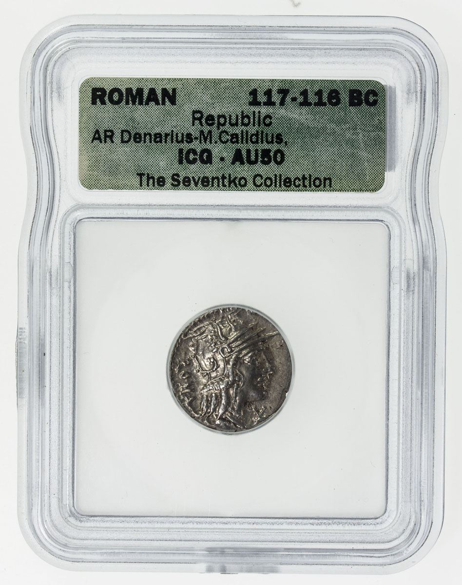 ROMAN REPUBLIC: M. Calidius, Q. Caecilius Metellus & Cn. Fulvius, 117/116 BC, AR denarius, Rome, S-160, helmeted bust of Roma // Victory in biga, holding wreath, rare variety with the governor's name inscribed CH FOVL above and M CAL Q MET below, ICG graded AU50.