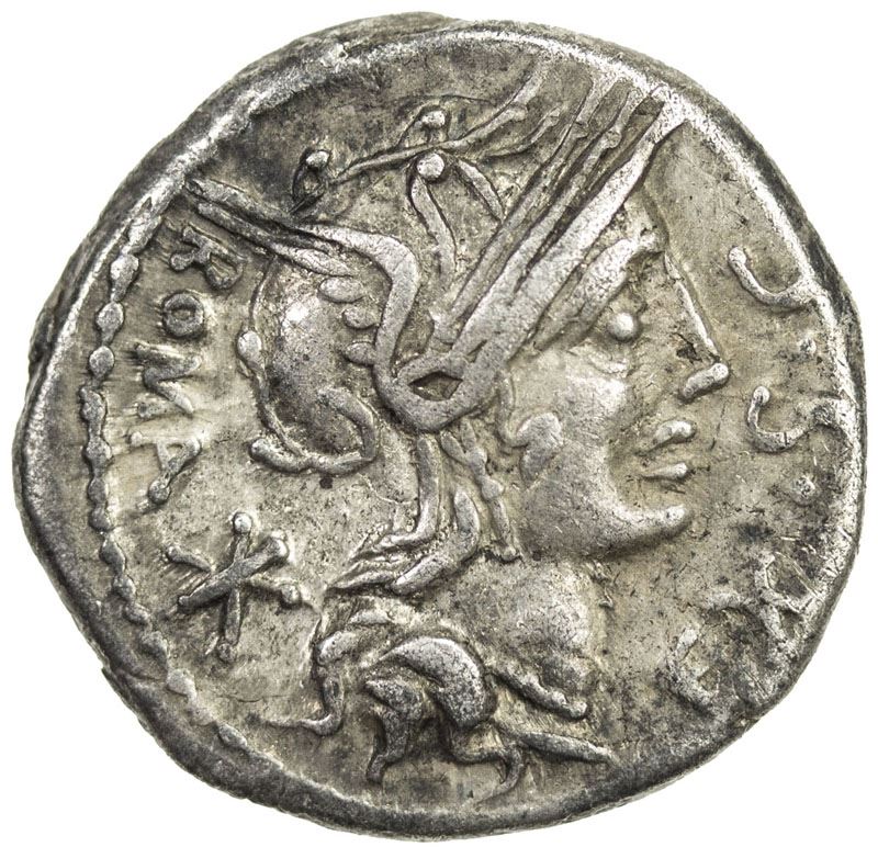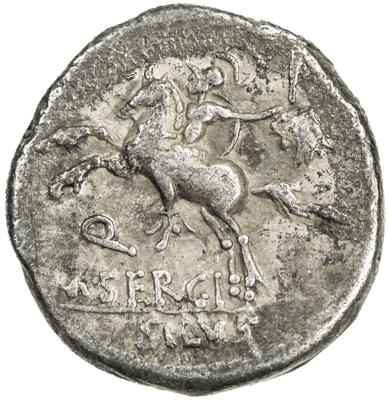ROMAN REPUBLIC: M. Sergius Silus, quaestor, 116-115 BC, AR denarius (3.76g), S-163, helmeted bust of Roma // horseman galloping left, holding sword & severed Gallic head, VF.