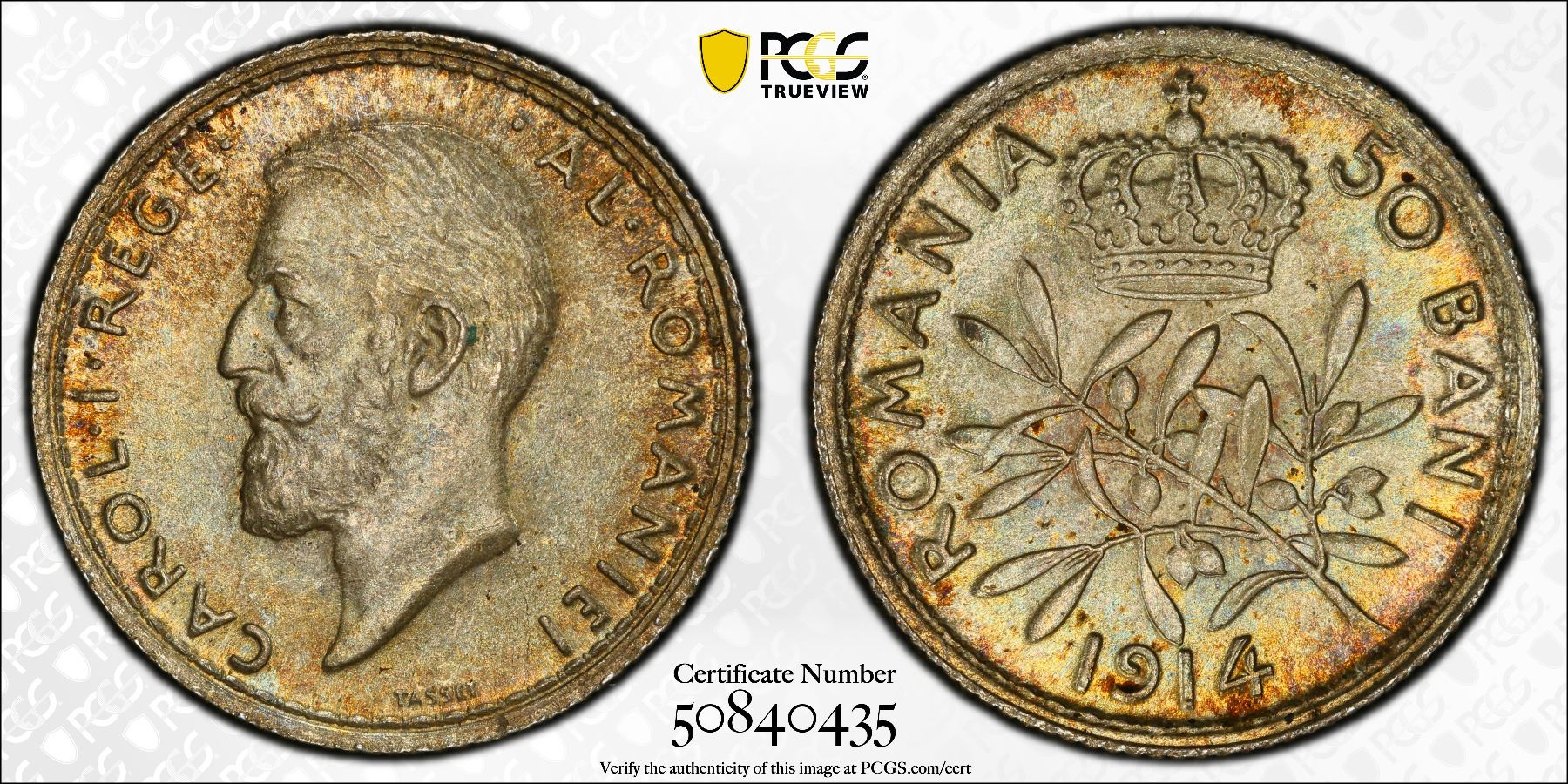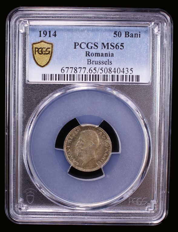 ROMANIA: Carol I, 1881-1914, AR 50 bani, Brussels, 1914, PCGS MS65