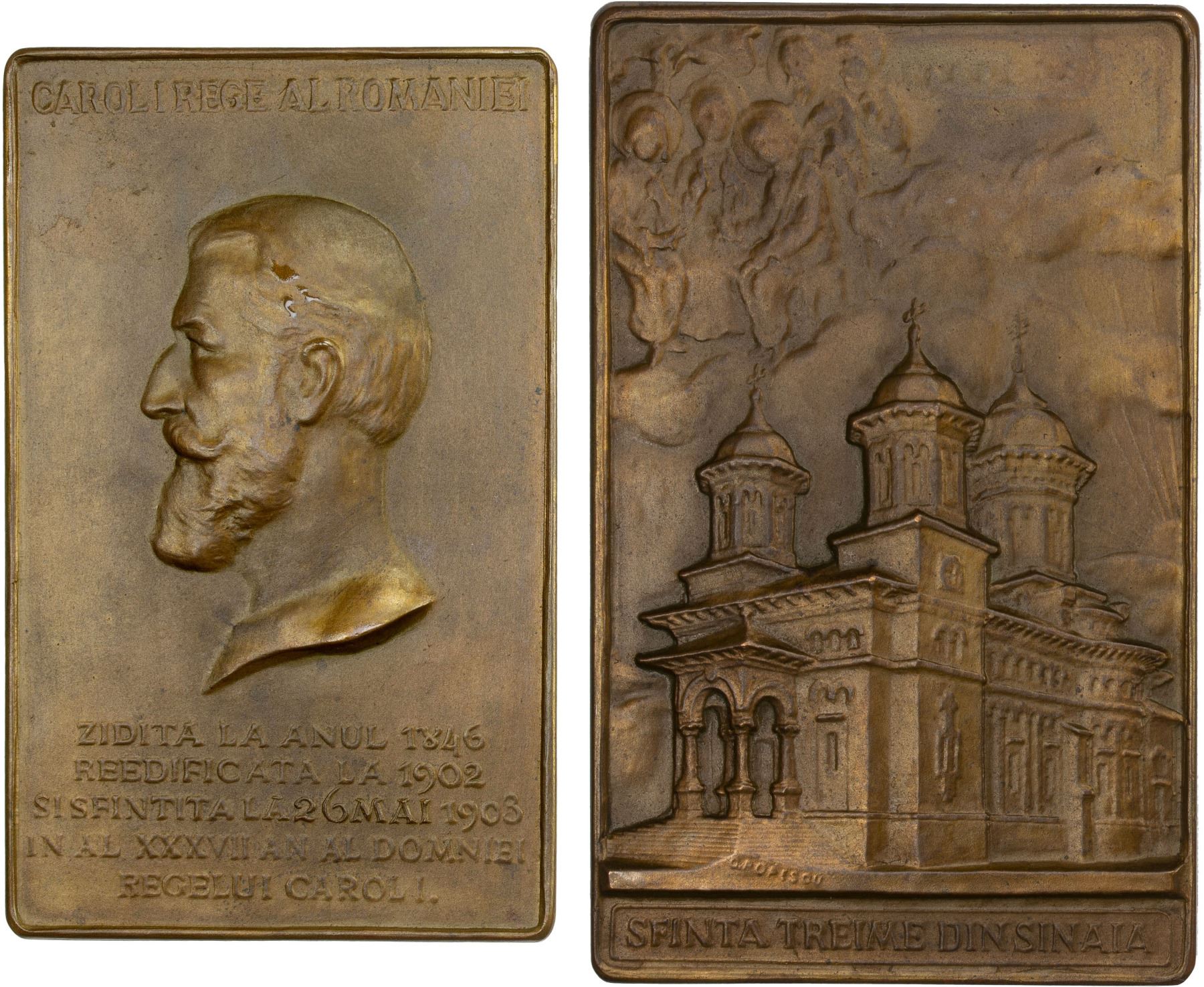 ROMANIA: Carol I, King, 1881-1914, AE plaque (116.2g), 1903, Buz. pg. 252, 80x50mm bronze plaque for the Consecration of Sfinta Treime Monastery in Sinaia by C. Popescu, bust left with CAROL I REGE AL ROMANIEI above and ZIDITA LA ANUL 1846 / BEEDIFICATA LA 1902 / SISFINTITA LA 26 MAI 1903 / IN AL XXXVII AN AL DOMNIEI / REGELUI CAROL I. below // three-quarter view of the church with SFINTA TREIME DIN SINAIA below, plain edge, Choice AU.