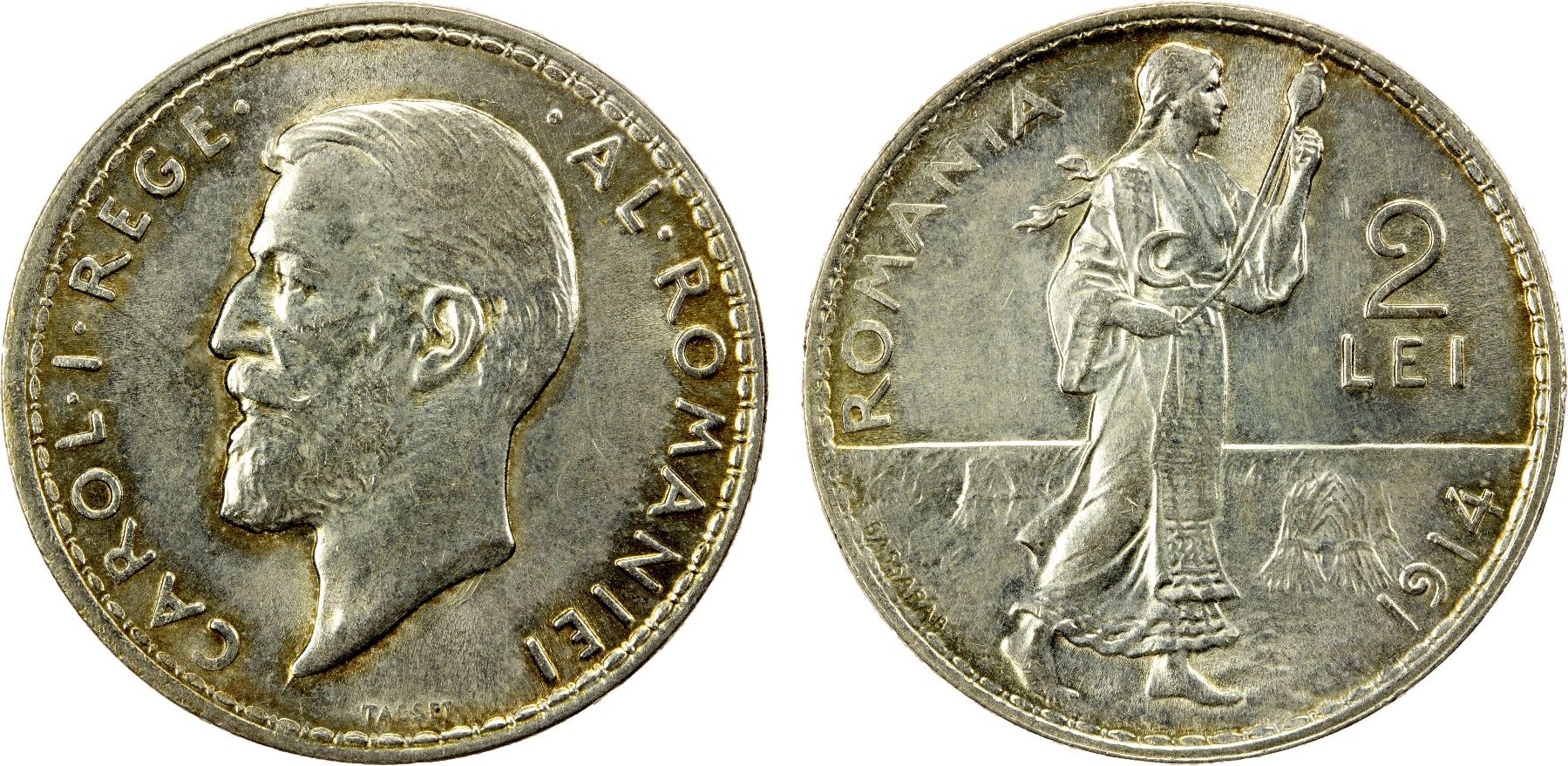 ROMANIA: Carol I, King, 1881-1914, AR 2 lei, 1914, Unc