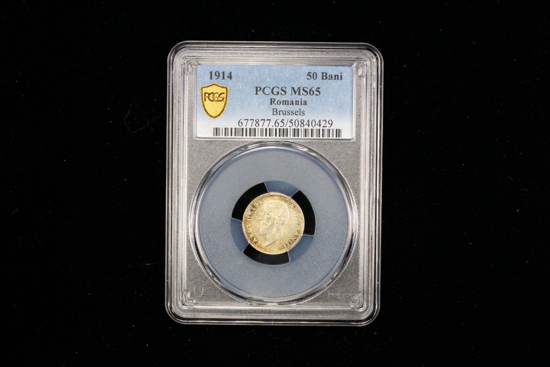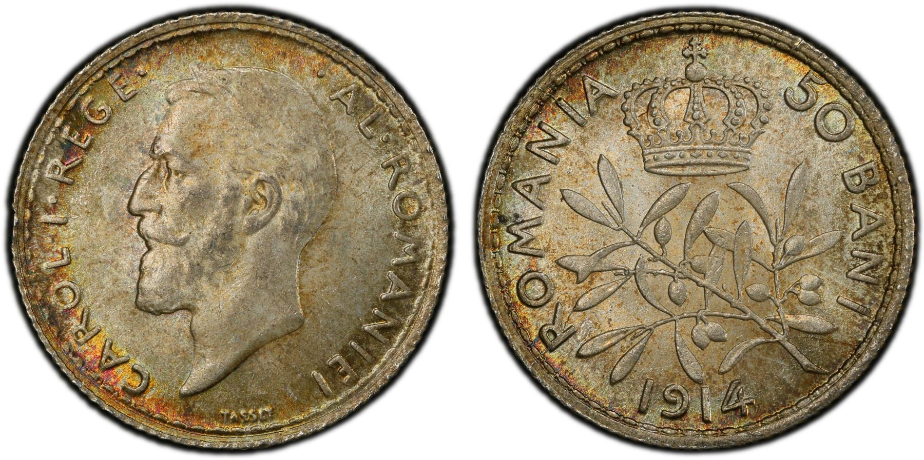 ROMANIA: Carol I, King, 1881-1914, AR 50 bani, Brussels, 1914, PCGS MS65