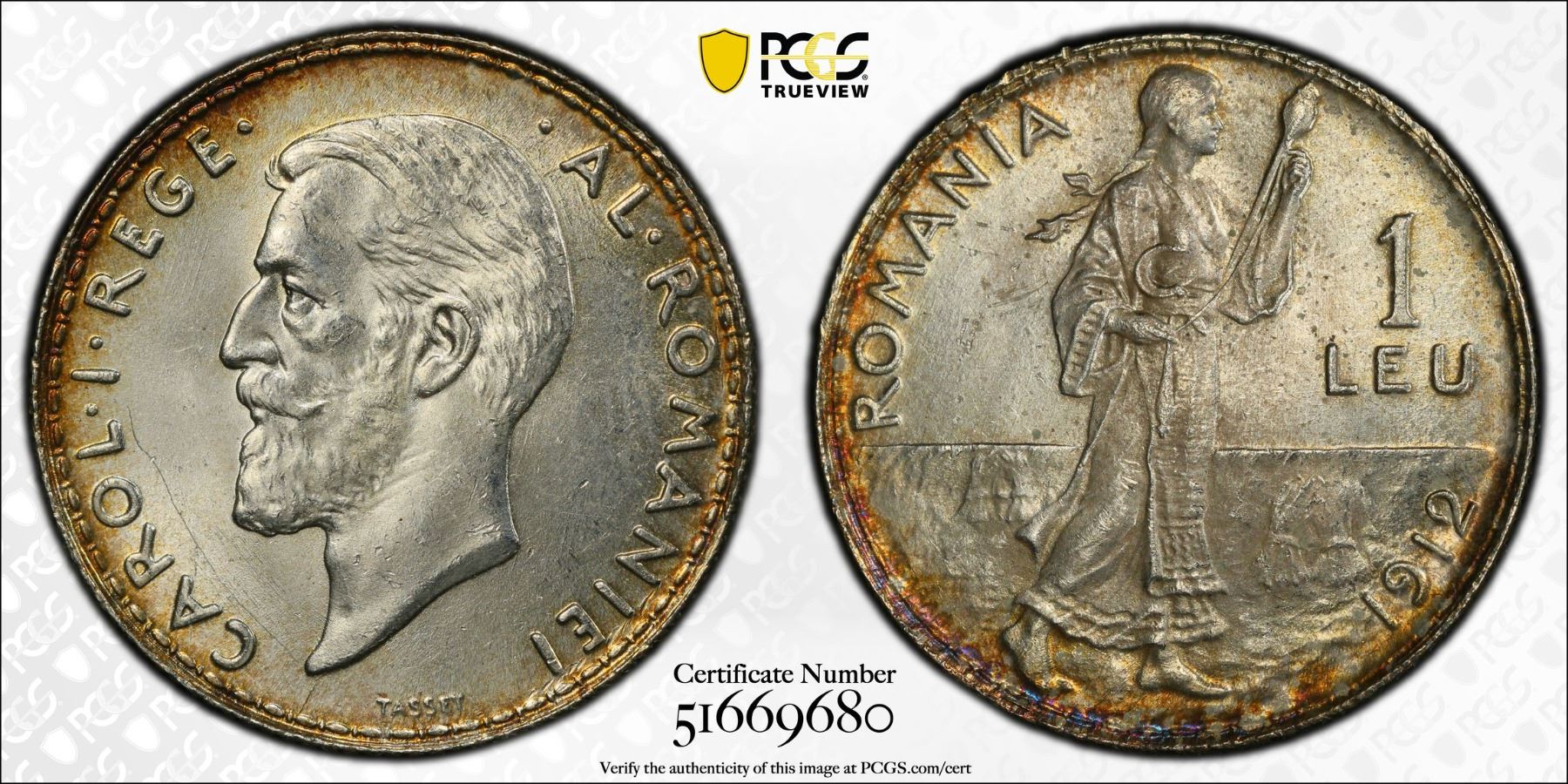 ROMANIA: Carol I, King, 1881-1914, AR leu, 1912, KM-42, struck at the Brussels mint, a lovely mint state example! PCGS graded MS63.