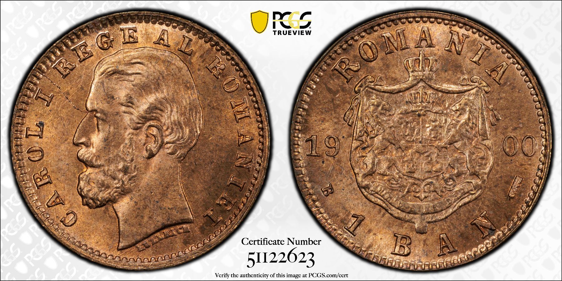 ROMANIA: Carol I, King, 1894-1914, AE ban, 1900-B, KM-26, Brussels Mint, a fantastic red lustrous mint state example! PCGS graded MS66 RD.