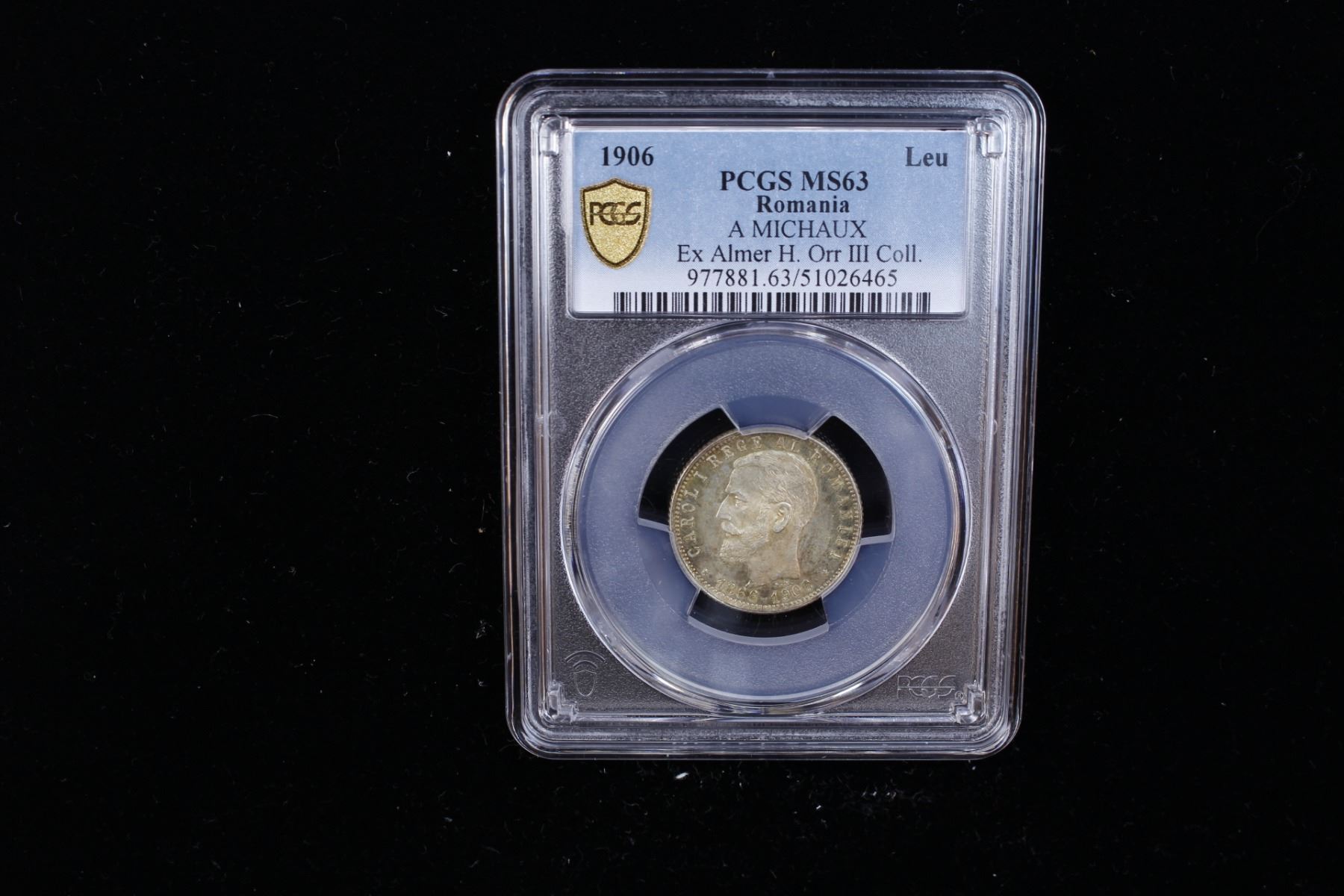 ROMANIA: Carol I, King, 1894-1914, AR leu, 1906, KM-34, struck at the Brussels Mint, variety without dot in signature, a lovely mint state example! PCGS graded MS63, ex Almer H. Orr III Collection.