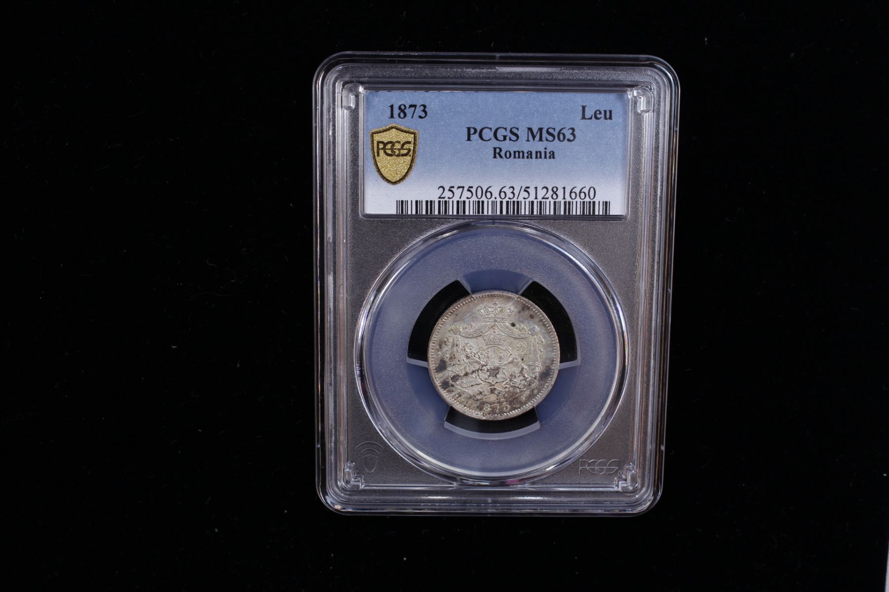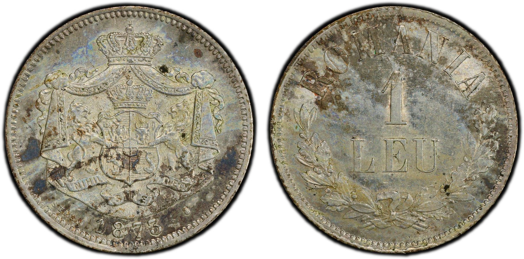 ROMANIA: Carol I, Prince, 1866-1881, AR leu, 1873, KM-10, minted in Brussels, some uneven areas of toning, overall lovely and lustrous, very rare in mint state, PCGS graded MS63.