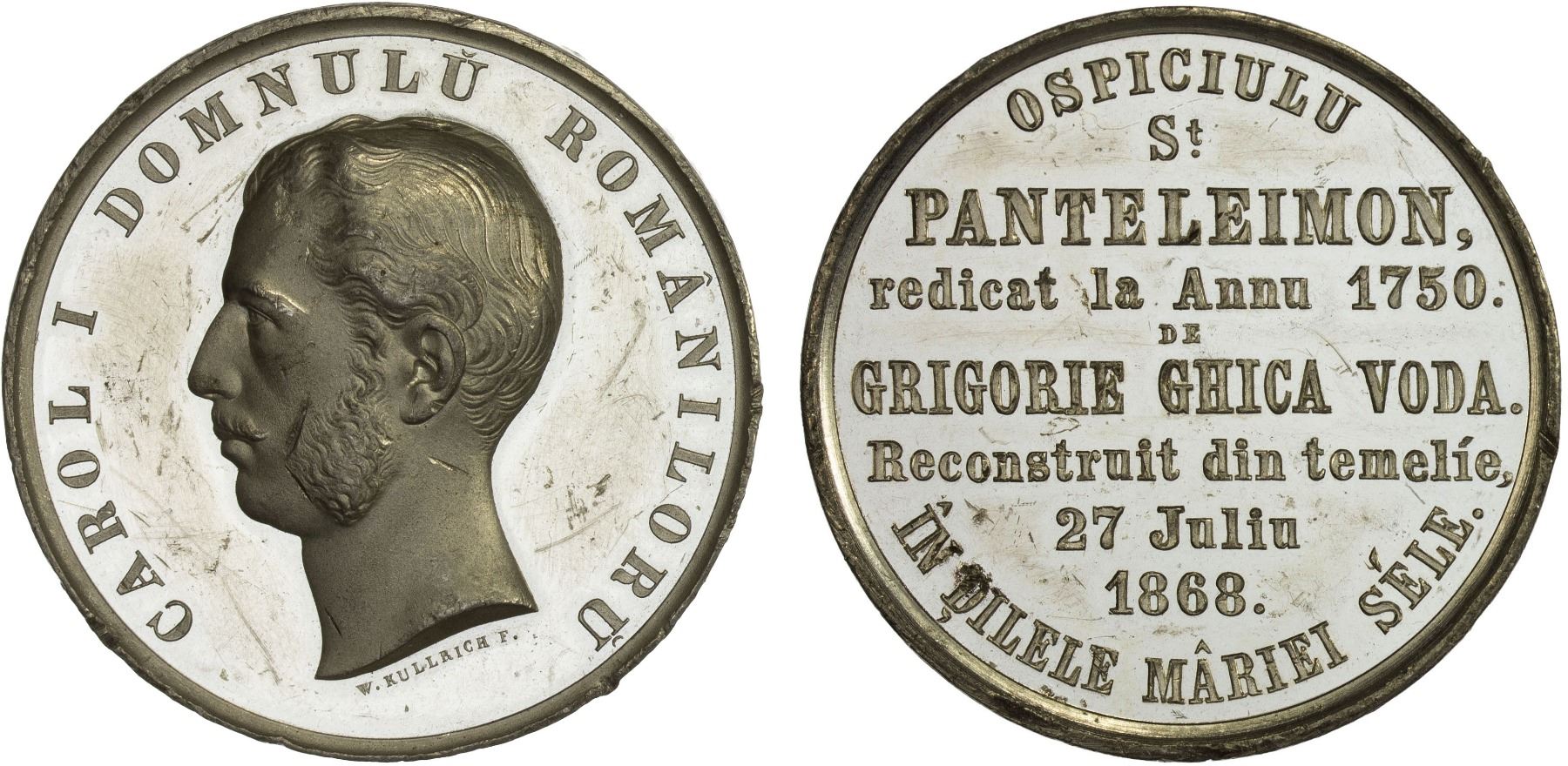 ROMANIA: Carol I, Prince, 1866-1881, medal (31.96g), 1868, Sommer-K 64, 41mm white metal medal for the reconstruction of St. Panteleimon Hospital in Bucharest by F. W. Kullrich, bust left with CAROL I DOMNULU ROMANILORU around // OSPICIULU / St. / PANTELEIMON. / redicat la Annu 1750. / DE / GRIGORIE GHICA VODA. / Reconstruit din temelíe, / 27 Juliu / 1868. / IN DILELE MÂRIEI SÉLE., lightly cleaned, some rim chatter and contact marks, prooflike, rare in white metal, plain edge, AU. The hospital was built in 1750 by the Voivode of Wallachia, Grigorio Ghica.