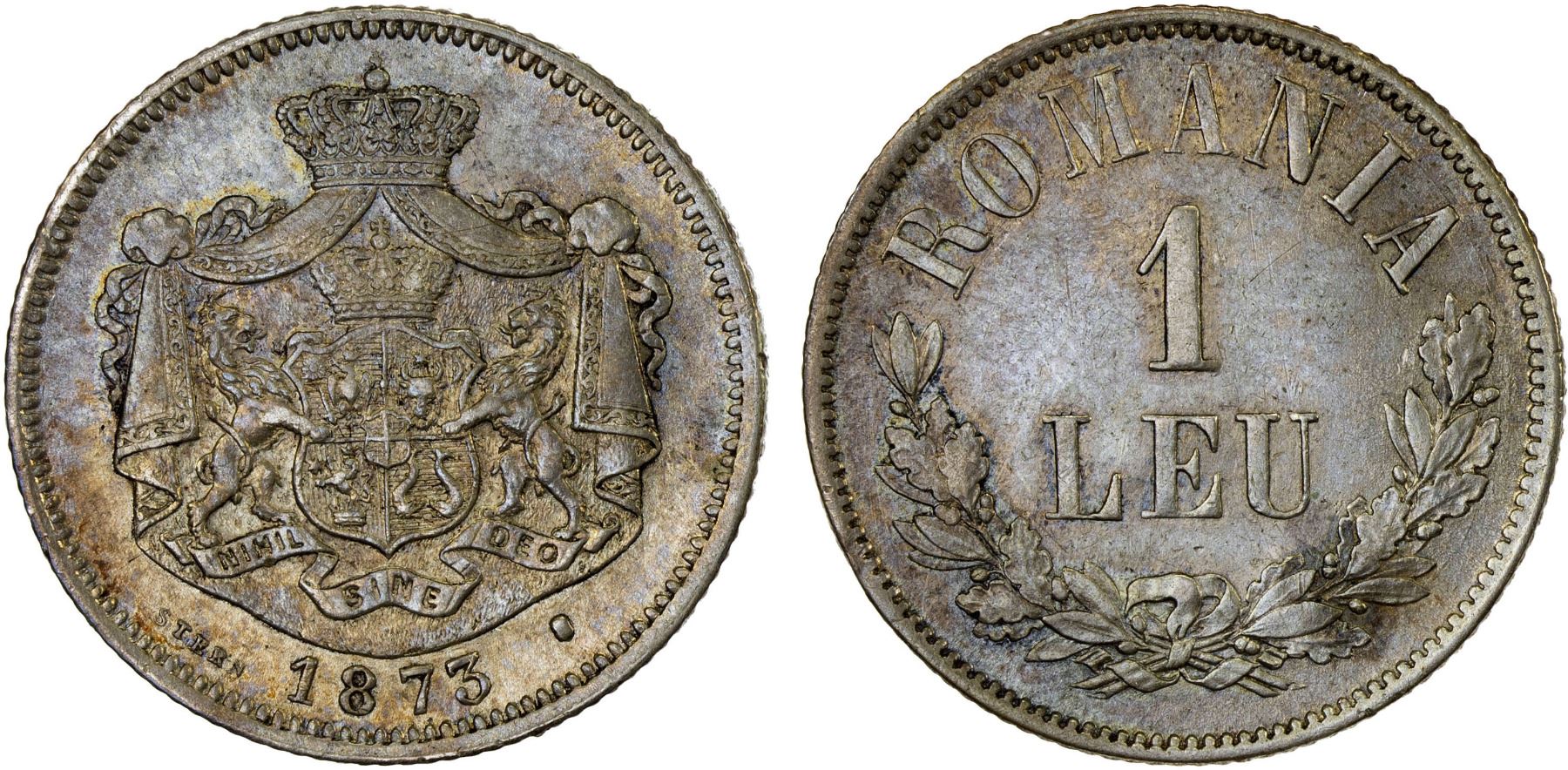 ROMANIA: Carol I, as Prince, 1866-1881, AR leu, 1873, KM-10, lightly toned, XF.