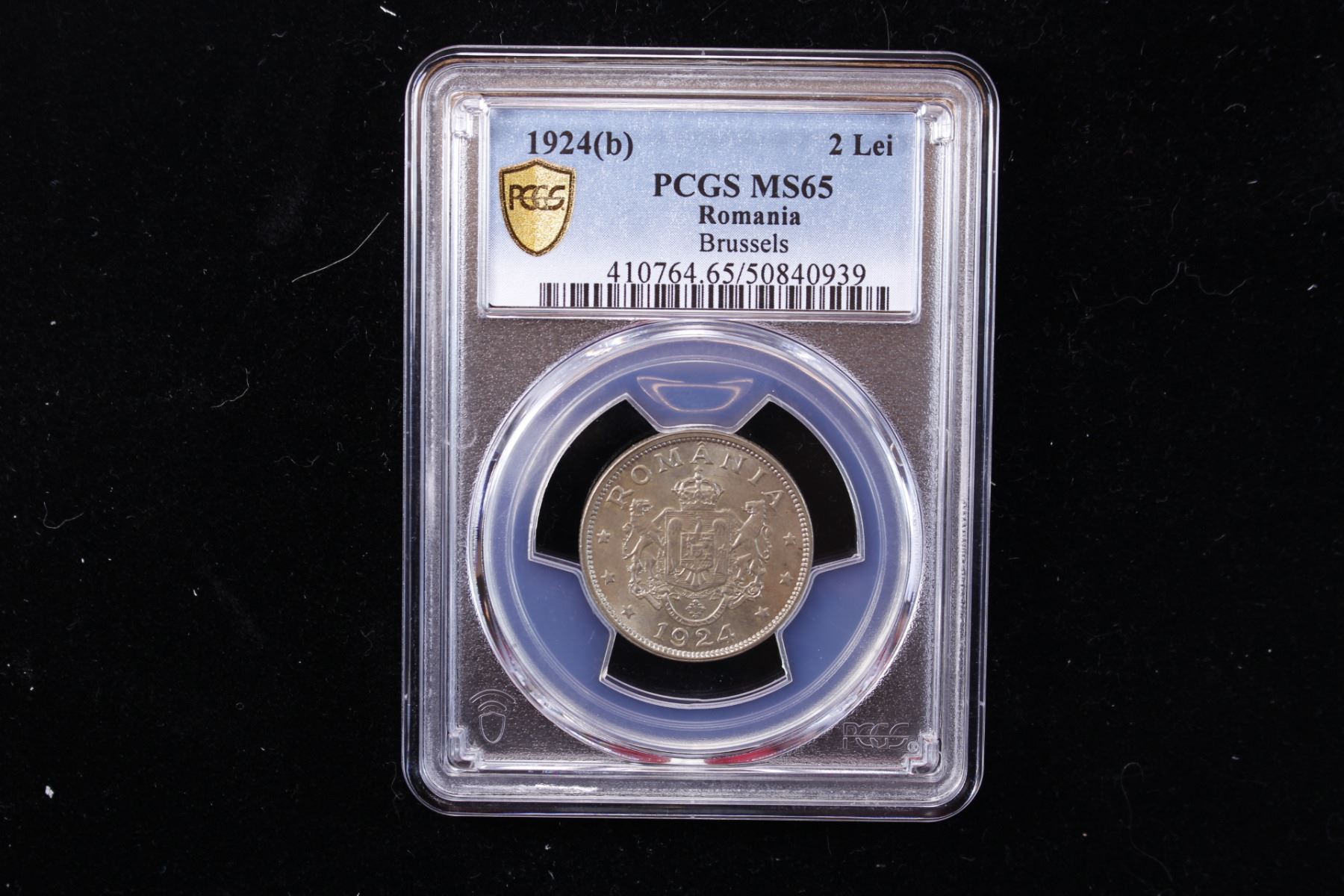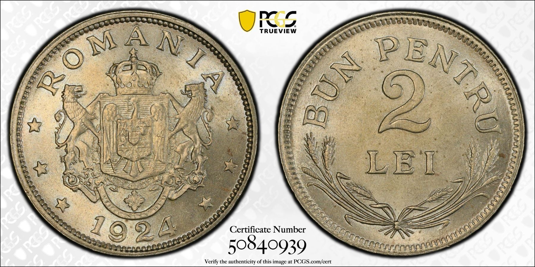ROMANIA: Ferdinand I, 1914-1927, 2 lei, Brussels, 1924, PCGS graded MS65