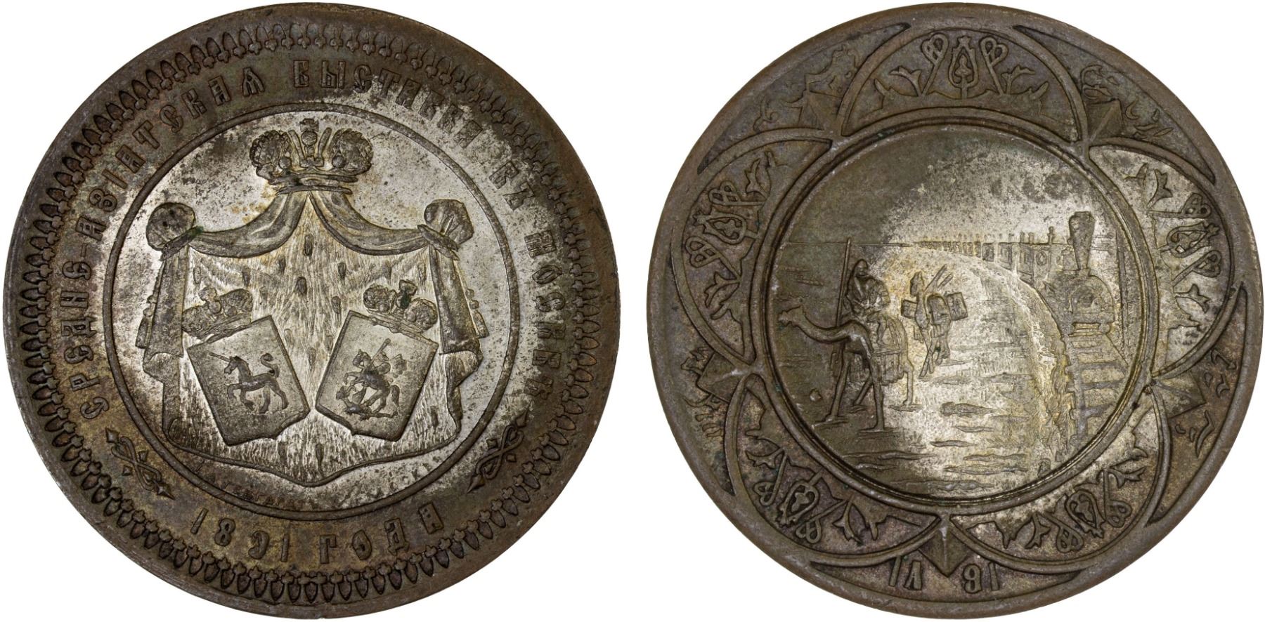 RUSSIA: AE medal (29.53g), 1891, Diakov-1061.2, 39mm silvered bronze medal for the Central Asian Exhibition in Moscow by A. Gebhardt, camel caravan advancing left with locomotive advancing at right, all within inner circle, with polylobe around with stylized flowers within and Arabic legends in spandrels, with date in Arabic numerals at bottom // crowned coats of arms of Russia and Turkestan, with crowned ermine mantle behind and Cyrillic legend and date around, rare, silvering incomplete on both sides (as made?), plain edge, XF.