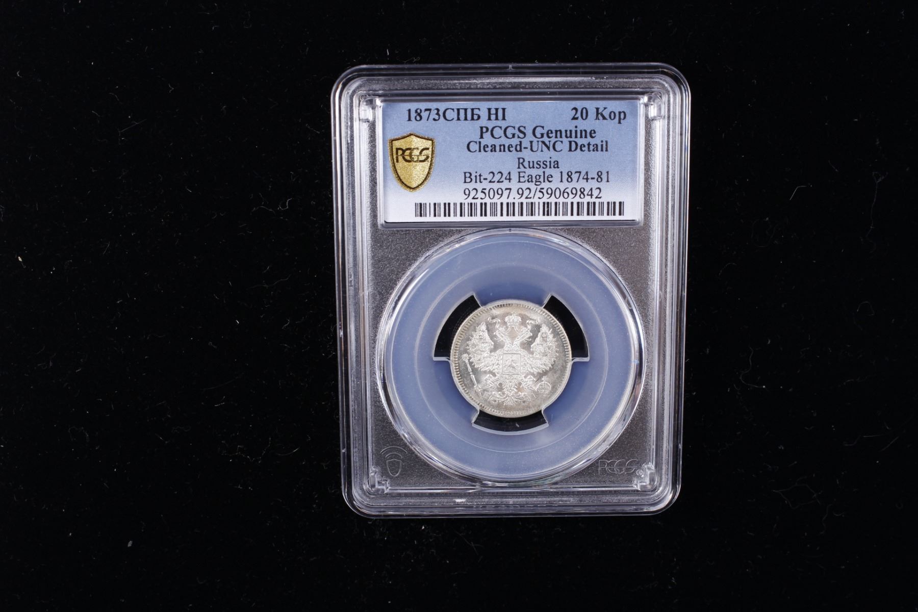 RUSSIA: Alexander II, 1855-1881, AR 20 kopeks, 1873, Y-22a.1, Bit-224, St. Petersburg Mint, Nikolai Iossa mintmaster, rare type with eagle of 1874-81, lightly cleaned, PCGS graded UNC details.